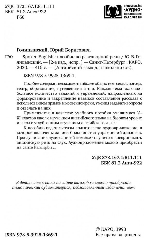 Сервис сравнения цен СкидкаГИД предлагает сравнить цены на товар «Книга: Spoken English. Пособие по разговорной речи (Голицынский Юрий Борисович); КАРО, 2019»
