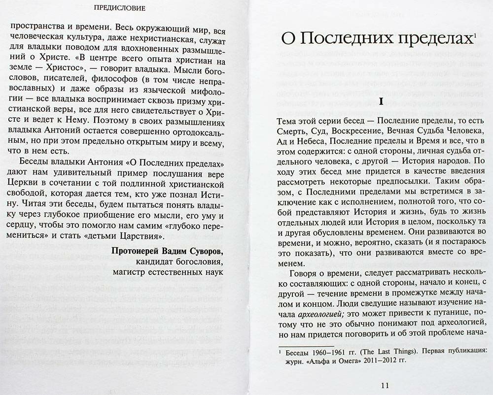 Небольшая, хорошо изданная книга "О Последних пределах" содержит беседы митрополита Сурожского Антония на эсхатологические темы. Четырнадцать бесед, каждая из которых отдельно не озаглавлена и не датирована, были впервые опубликованы в журнале "Альфа и Омега" в 2011-12 годах. Как отмечает в предисловии протоиерей Вадим Суворов, "в своих размышлениях владыка Антоний остаётся совершенно ортодоксальным, но при этом предельно открытым миру и всему, что в нём есть". Беседы владыки Антония, в которых нет ни одной пустой фразы, помогают более глубокому осмыслению и восприятию жизни - и смерти, они питают и воспитывают душу. Следовать за его размышлениями - особое переживание, в котором задействованы и интеллект, и душа, поэтому новое издание бесед Владыки - прекрасный подарок для ценителей и, надо надеяться, радостное удивление для тех, кто ещё не открывал книг митрополита Антония.