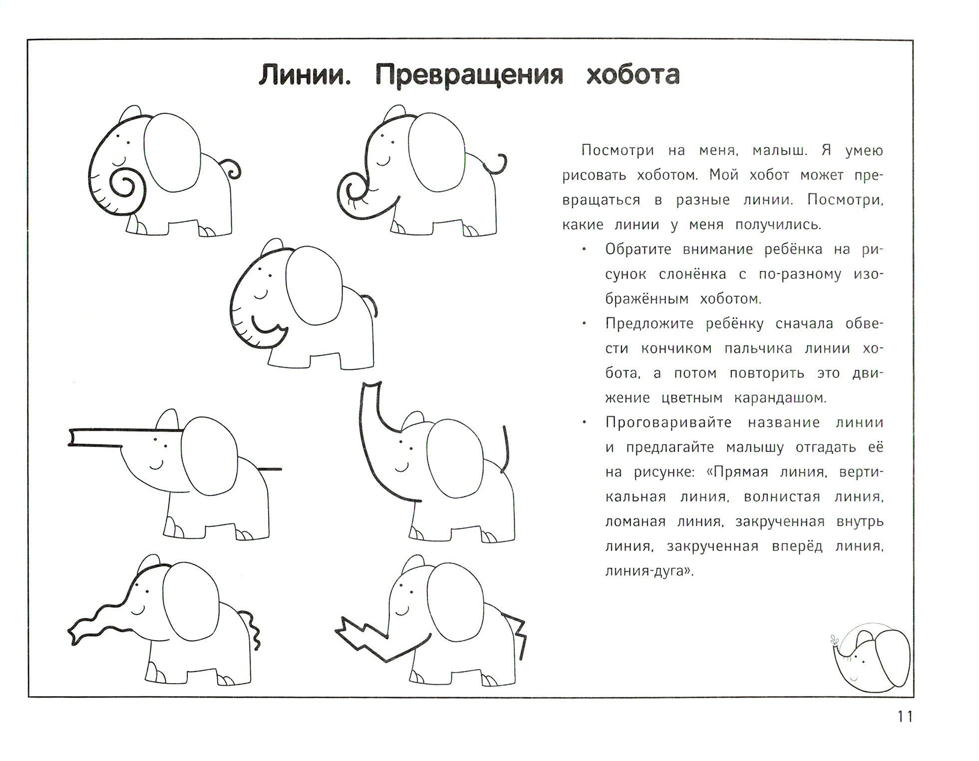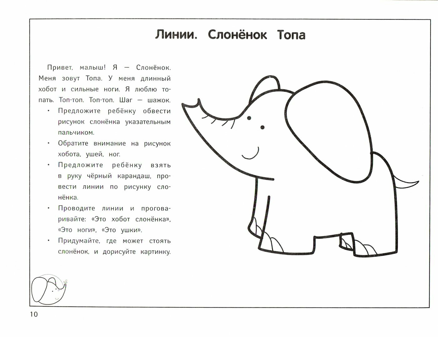Внимательный Слонёнок Топа - главный герой альбома и ваш помощник в рисовании. Для малыша это ещё и увлекательная игрушка. Каждое задание представлено очень понятно и логично. Есть небольшие комментарии, которые помогут в рисовании.