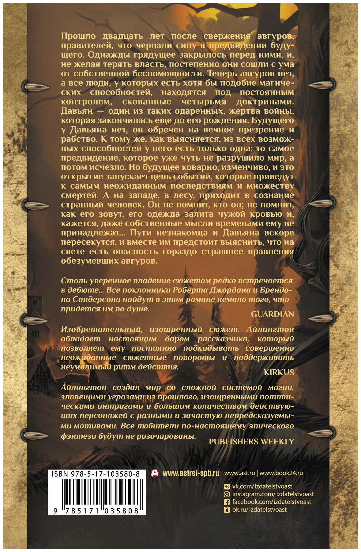 Прошло двадцать лет после свержения авгуров, правителей, что черпали силу в предвидении будущего. Однажды грядущее закрылось перед ними, и, не желая терять власть, постепенно они сошли с ума от собственной беспомощности. Теперь авгуров нет, а все люди, у которых есть хотя бы подобие магических способностей, находятся под постоянным контролем, скованные четырьмя доктринами. Давьян - один из таких одаренных, жертва войны, которая закончилась еще до его рождения. Будущего у Давьяна нет, он обречен на вечное презрение и рабство. К тому же, как выясняется, из всех возможных способностей у него есть только одна: то самое предвидение, которое уже чуть не разрушило мир, а потом исчезло. Но будущее коварно, изменчиво, и это открытие запускает цепь событий, которые приведут к самым неожиданным последствиям и множеству смертей. А на западе, в лесу, приходит в сознание странный человек. Он не помнит, кто он; не помнит, как его зовут, его одежда залита чужой кровью и, кажется, даже собственные мысли временами ему не принадлежат... Пути незнакомца и Давьяна вскоре пересекутся, и вместе им предстоит выяснить, что на свете есть опасность гораздо страшнее правления обезумевших авгуров.