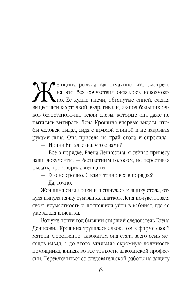 Мое первое знакомство с автором началось с книг из цикла про следователя прокуратуры Лену Крошину. И могу сказать, что уже давно у меня не было столь удачных знакомств, когда книга затягивает с первых же страниц, а главный герой становится тебе практически родным. Слог у автора очень легкий, сюжет динамичный. Книга читается очень быстро, я прочитала буквально за вечер. А больше всего мне понравилось, что помимо детективной линии, в книге большое внимание уделено личным отношениям и переживаниям героев. Мне кажется, это всегда делает героя к тебе ближе, располагает к нему. И после того, как перевернута последняя страница, очень хочется продолжения.
