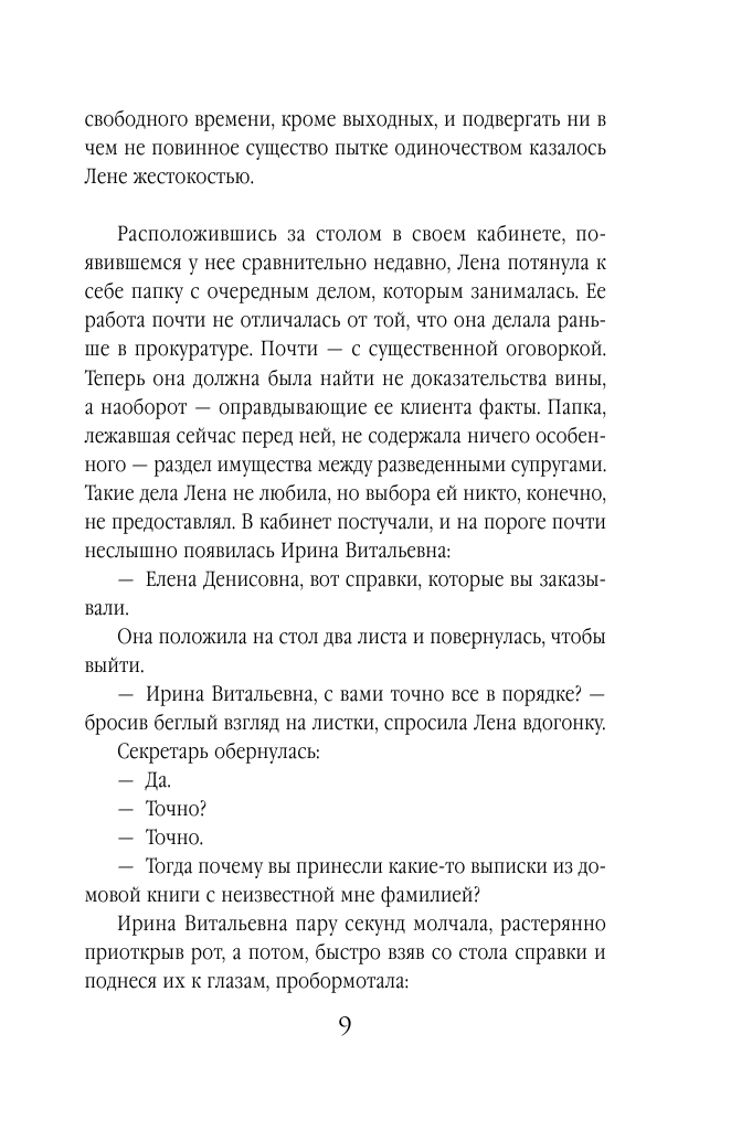 Никто из сотрудников адвокатской фирмы не замечал, что с секретарем Ириной Яровой - и без того дамой довольно странной - происходит что-то необычное. Только бывшему старшему следователю прокуратуры Лене Крошиной показалось поведение женщины подозрительным. А вот была ли тому виной найденная на секретарском столе яркая визитка экстрасенса Белькевича или Иринина рассеянность и чрезмерная задумчивость, Лена сказать не могла. Но интуиция ее не обманула - однажды всегда обязательная Ирина не явилась на работу, а вскоре выяснилось, что она вообще исчезла, причем вместе со своей больной парализованной матерью…