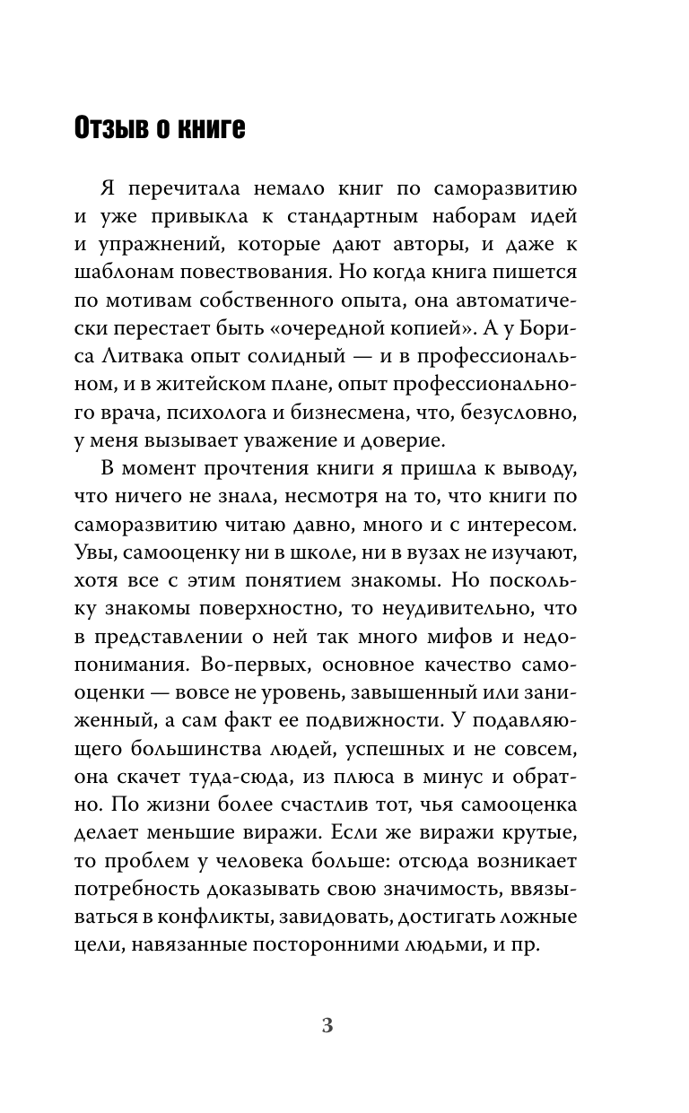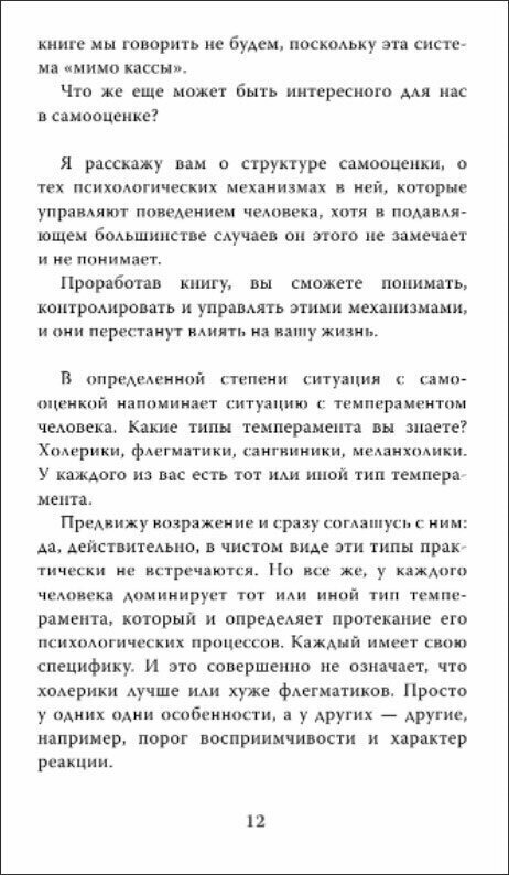 Для людей понимающих, что у них есть некоторые проблемы с самооценкой эта книга must read! Описан авторский взгляд на тему самооценки, который я не встречал у других авторов. Книга полностью повторяет семинар, который я проходил два года назад, а книгу прочитал для закрепления информации. В свое время изложенная информация стала для меня откровением и помогла многое изменить в лучшую сторону. Забавно, но с психологической точки зрения, я оказался таким типовым продуктом, все мои затруднения давно изучены и есть способы решения. Уверен, эта информация поможет многим людям. В книге есть упражнения и конкретные рекомендации как справляться со своими "затыками", так что если вы можете работать над собой самостоятельно, то хватит и её. Автору низкий поклон и благодарность.