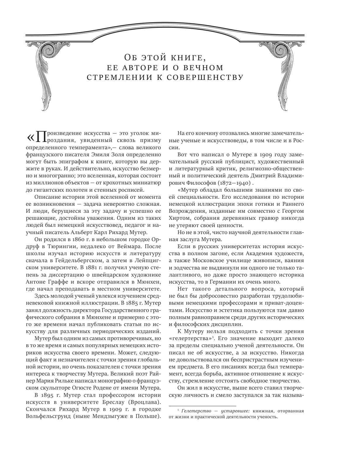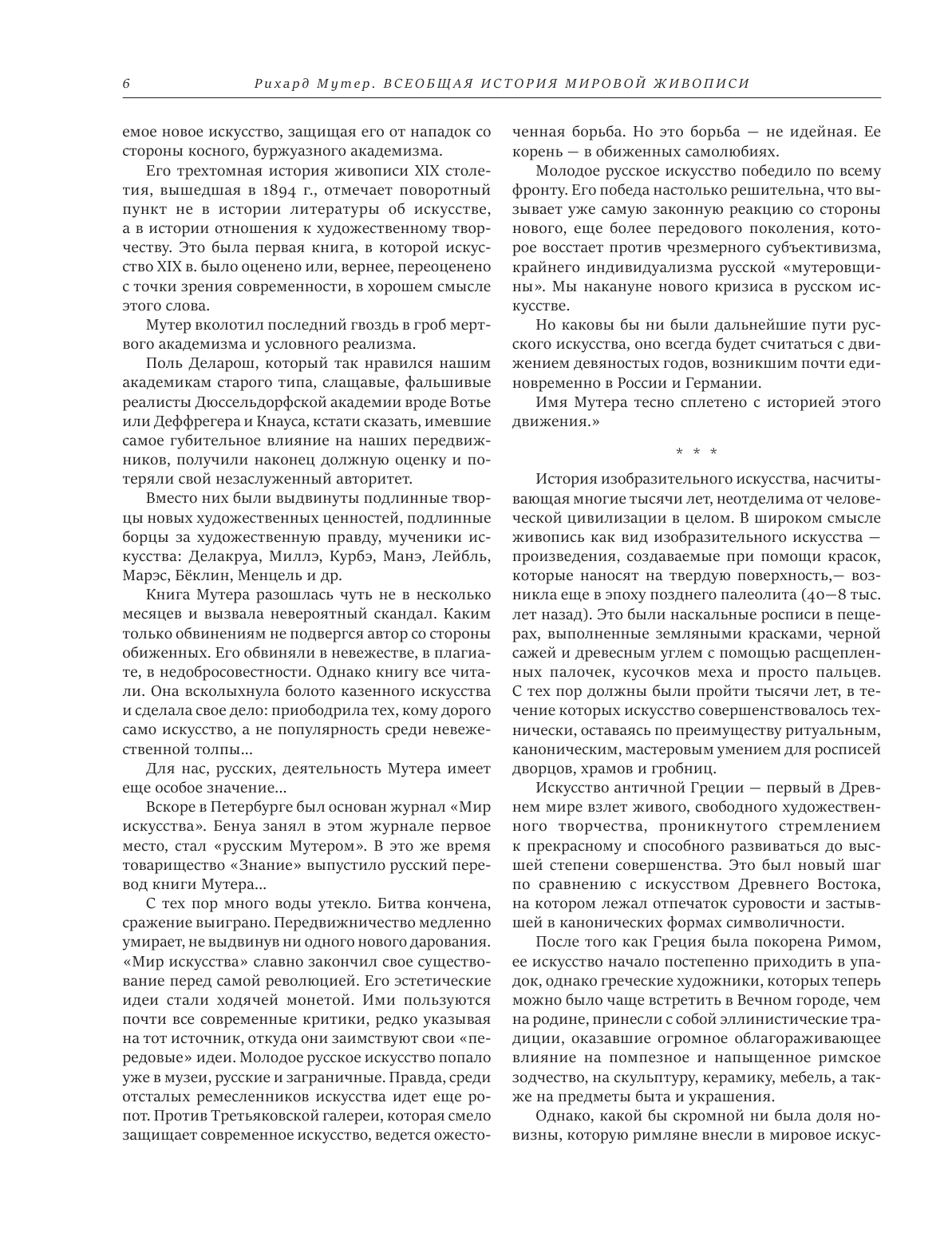 Книга Рихарда Мутера, вышедшая из печати в 1894 г., разошлась в несколько месяцев и вызвала настоящую общественную бурю. Вердикт читающей публики был таков: "Мутер вколотил последний гвоздь в гроб мертвого академизма и условного реализма" (Д. В. Философов). Книга стала блестящим триумфом, какого только можно пожелать научному писателю: его книга признана первым трудом, в котором искания новаторов XIX века были оценены по достоинству. Книга Мутера считается поворотным пунктом не только в истории литературы об искусстве, она знаменует начало новой истории отношения к художественному творчеству как способу познания и преображения мира.