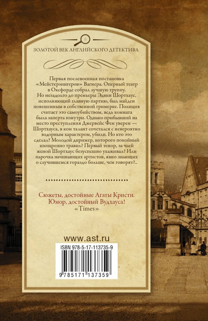 Первая послевоенная постановка "Мейстерзингеров" Вагнера. Оперный театр в Оксфорде собрал лучшую труппу. Но незадолго до премьеры Эдвин Шортхаус, исполняющий главную партию, был найден повешенным в собственной гримерке. Полиция считает это самоубийством, ведь комната была заперта изнутри. Однако прибывший на место преступления Джервейс Фен уверен - Шортхауса, в ком талант сочетался с невероятно вздорным характером, убили. Но кто это сделал? Молодой дирижер, которого покойный изощренно травил? Первый тенор, за чьей женой Шортхаус безуспешно ухаживал? Или парочка начинающих артистов, явно знающих о случившемся гораздо больше, чем говорят?..