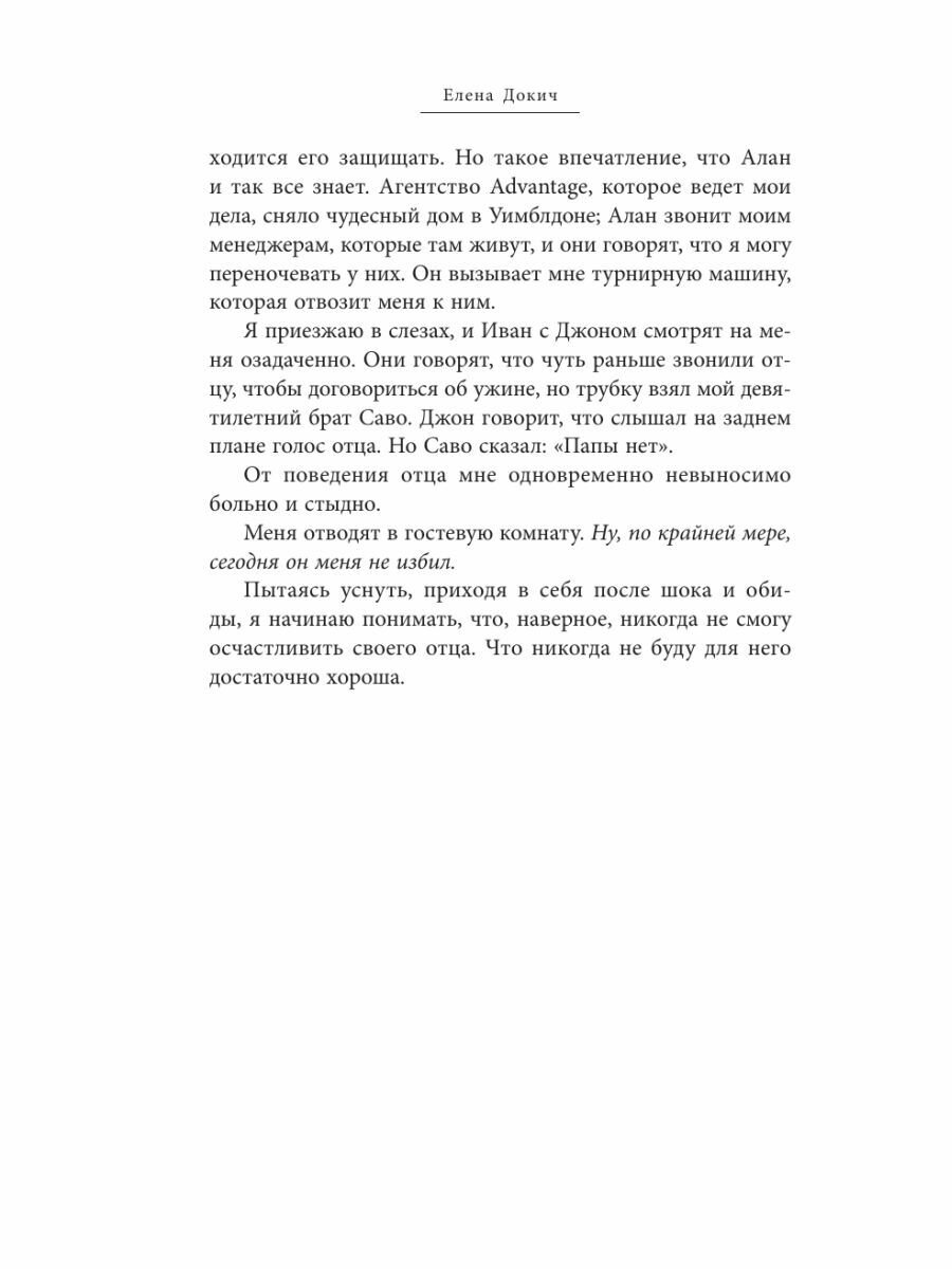 Хорошая книга, история сильного человека, который несмотря на все жизненные трудности, сумела найти в себе силы побороть себя, вернутся к нормальной жизни и покорять новые вершины. В книге в основном повествуется о жизни Докич, но немало уделено ее карьере и спорту, можно узнать многое о теннисном мире.