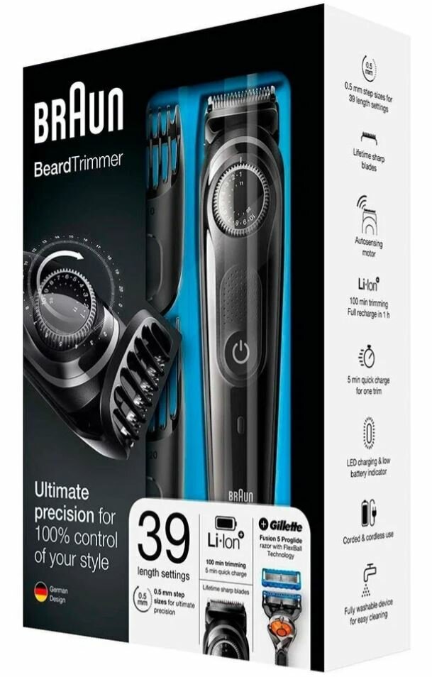 Триммер Braun BT 5042 используется для влажной или сухой стрижки бороды или усов. Парикмахерский инструмент с 2 насадками предназначен для профессионального применения в салонах красоты.