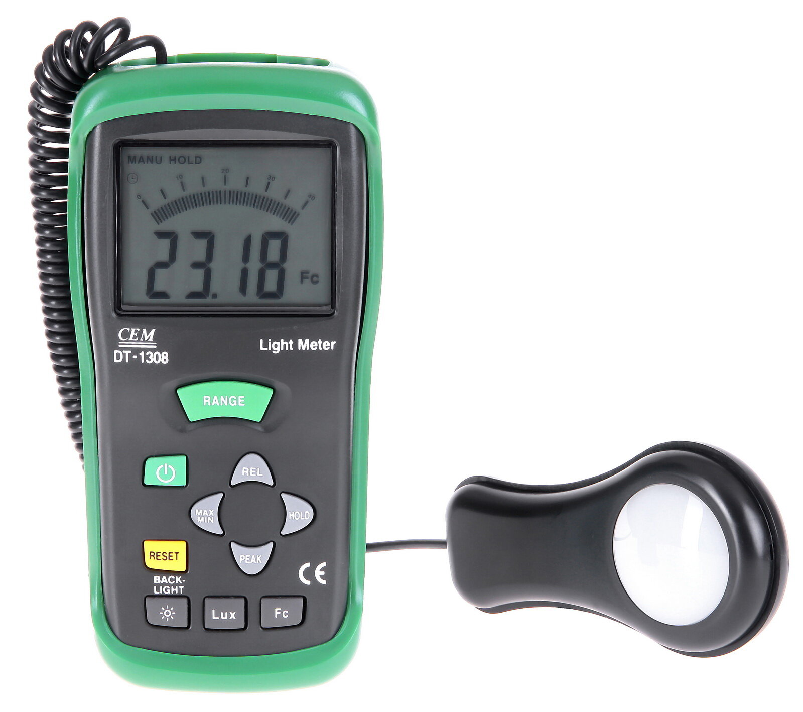 Имеритель освещенности DT-1308 спроектирован для измерения освещенности в ед. люкс или фут-кандела. Спектральная чувствительность прибора соответствует относительной спектральной световой эффективности C.I.E. Измеритель освещенности (люксметр) CEM DT-1308 полностью скорректирован по косинусу от ошибки при измерении освещённости, создаваемой светом, падающим под углом. В качестве светочувствительного датчика в этом приборе используется высокостабильный, с продолжительным сроком службы кремниевый фотодиод со специальным корригирующим фильтром. Особенности • Прибор характеризуется высокой чувствительностью и быстрым откликом. • Возможность фиксации текущего измеренного значения. • Автоматическая установка нуля. • Спектральная чувствительность люксметра DT-1308 скорректирована к спектральной чувствительности человеческого глаза. • Не требуются дополнительные вычисления для нестандартных источников света. • Короткое время нарастания и спада. • Пиковый детектор позволяет регистрировать импульсный сигнал с минимальной длительностью 10мкс. • Возможность выбора размерности измерений: люкс или фут-кандела. • Регистрация минимального и максимального результатов измерений. • Относительные измерения и автоматическая установка нулевого показания. • Измеритель освещенности (люксметр) C.E.M. DT-1308 имеет легко читаемый большой дисплей с подсветкой. • Разрядность шкалы измерителя освещенности: 4000 отсчетов • Освещенность: 400/4000/40 000/300 000Lux: ±5.0% (10000 Lux) • Удержание показаний MAX HOLD и DATA HOLD • Режим регистрации пиковых значений PEAK HOLD • Режим относительных измерений • Автоматический выбор диапазона изменений • Графическая шкала 41 сегмент • Выбор функции измерения FC/Lux • Скорость: 1.5 измерения в секунду • Автоотключение Auto Power Off • Габариты: 170x80х40 (мм), вес 390 г. (сенсор 115х60х20 мм)