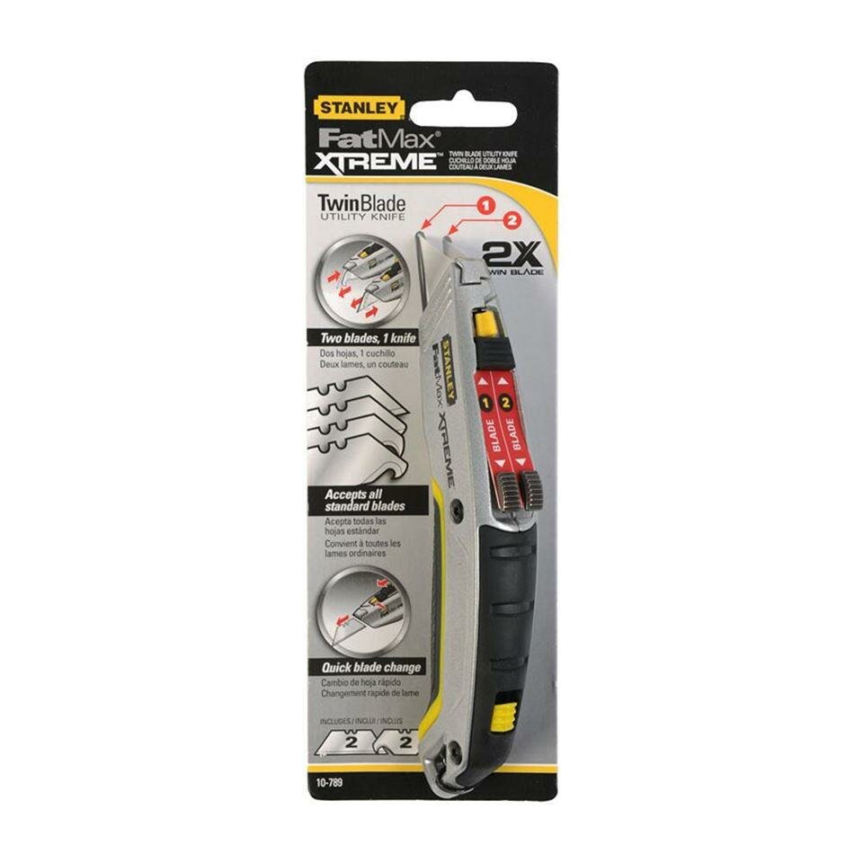 Нож FatMax XL Stanley 0-10-789 используется для разрезания коробок или обоев, укрывных материалов. Корпус металлический, оснащен резиновой вставкой, которая способствует более комфортному удержанию инструмента. Нож имеет два движка для выдвигания лезвий. Конструкция выполнена таким образом, что одновременное выдвижение двух лезвий невозможно. Прочный корпус выдерживает большие нагрузки. Нож имеет отсек для пяти сменных лезвий.