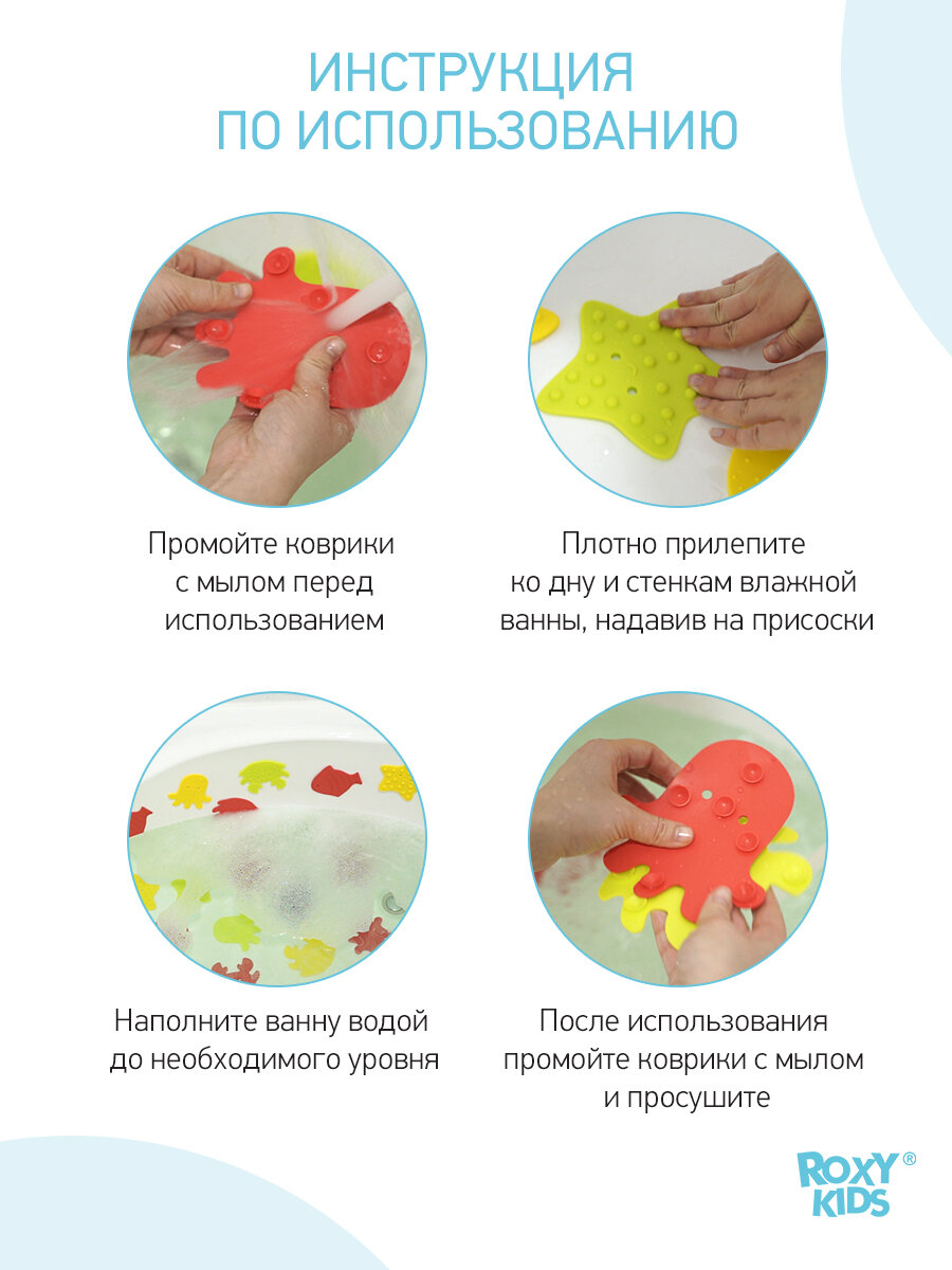 Антискользящие мини-коврики от ROXY-KIDS- первые многофункциональные мини-коврики, произведенные в России из абсолютно безопасных материалов. Особенность этих малышей в виде морских животных в том, что им действительно можно найти множество применений: антискользящая поверхность для купания: отличная замена большому коврику, который неудобно промывать и сушить, массажер: рельефная поверхность (маленькие точки, зигзаги, большие пупырышки) обеспечивает бережный массаж стоп и ладоней, грызунок: мини-коврики произведены из термоэластопласта – материала современных прорезывателей, поэтому вы без опаски можете позволить малышу тянуть их в рот, развивашка: мало того, что это тренажер для развития мелкой моторики и хватательных рефлексов, с мини-ковриками от ROXY-KIDS ваш малыш познакомится с названиями морских обитателей (в комлекте рыбка, осьминог, краб и морская звезда) и выучит основные цвета, украшение интерьера: налепите коврики на дно и стенки ванны, на кафель или даже на пол, чтобы не только обеспечить удобство, но и расставить яркие цветовые акценты! Кроме того, эти мини-коврики абсолютно не пахнут, ведь не содержат ПВХ. Они просты в уходе: достаточно просто периодически промывать их с мылом, полоскать и сушить. Они легко и надежно крепятся с помощью присосок на любую гладкую поверхность, при этом не оставляют следов.