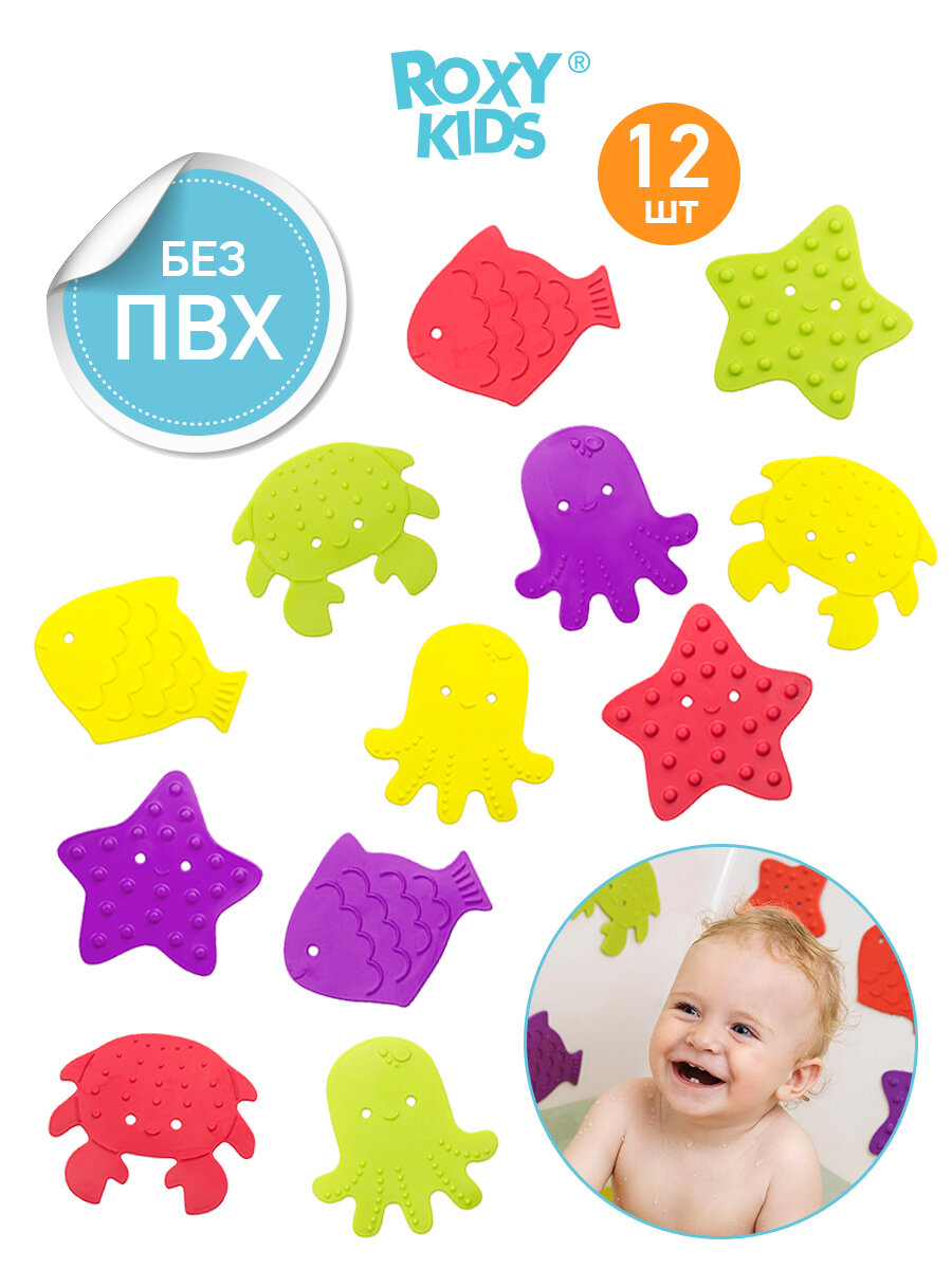 Антискользящие мини-коврики от ROXY-KIDS- первые многофункциональные мини-коврики, произведенные в России из абсолютно безопасных материалов. Особенность этих малышей в виде морских животных в том, что им действительно можно найти множество применений: антискользящая поверхность для купания: отличная замена большому коврику, который неудобно промывать и сушить, массажер: рельефная поверхность (маленькие точки, зигзаги, большие пупырышки) обеспечивает бережный массаж стоп и ладоней, грызунок: мини-коврики произведены из термоэластопласта – материала современных прорезывателей, поэтому вы без опаски можете позволить малышу тянуть их в рот, развивашка: мало того, что это тренажер для развития мелкой моторики и хватательных рефлексов, с мини-ковриками от ROXY-KIDS ваш малыш познакомится с названиями морских обитателей (в комлекте рыбка, осьминог, краб и морская звезда) и выучит основные цвета, украшение интерьера: налепите коврики на дно и стенки ванны, на кафель или даже на пол, чтобы не только обеспечить удобство, но и расставить яркие цветовые акценты! Кроме того, эти мини-коврики абсолютно не пахнут, ведь не содержат ПВХ. Они просты в уходе: достаточно просто периодически промывать их с мылом, полоскать и сушить. Они легко и надежно крепятся с помощью присосок на любую гладкую поверхность, при этом не оставляют следов.