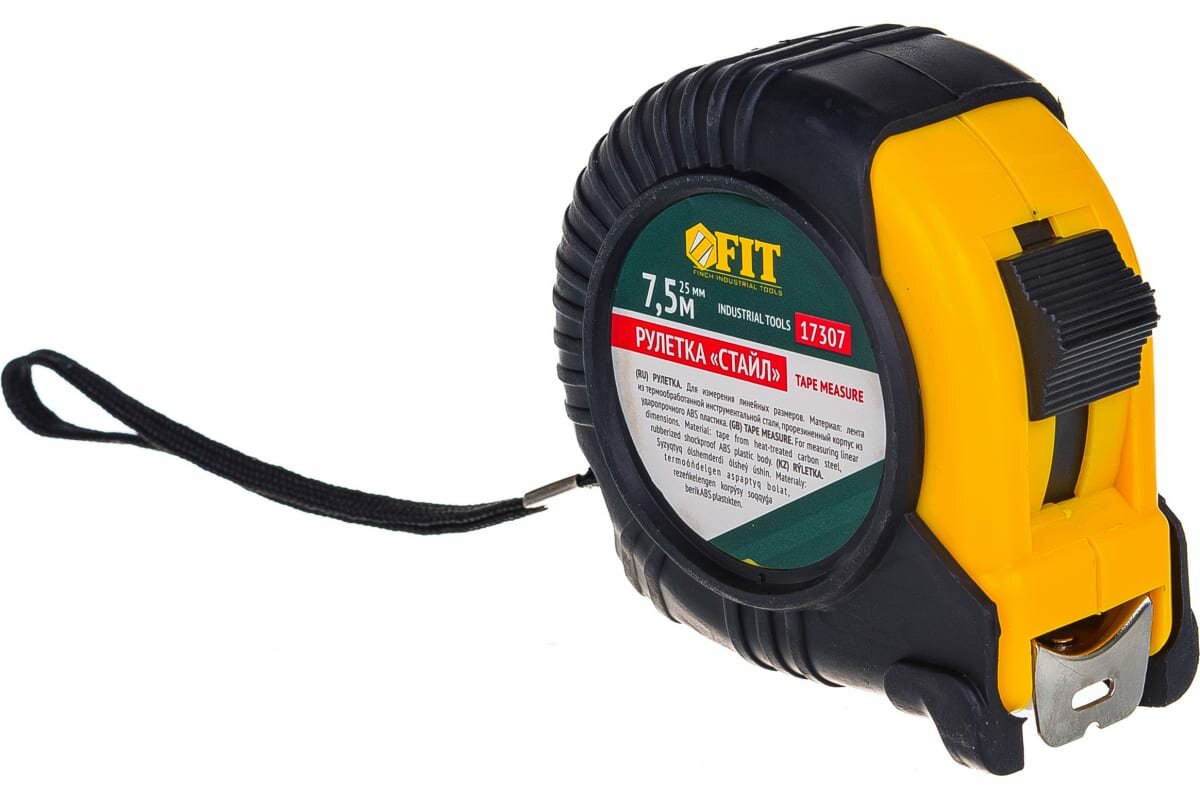 Рулетка Профи Стайл FIT 17307 отличается отличным дизайном и точностью измерений. Подходит для профессиональных работ. Изделие не проскальзывает в руке, благодаря корпусу с резиновыми элементами. Полотно длиной 7.5 м и толщиной 25 мм изготовлено из стали, что увеличивает его срок службы. У рулетки Профи Стайл FIT 17307 имеется ремешок, который позволяет носить её на руке и хранить в подвешенном состоянии.