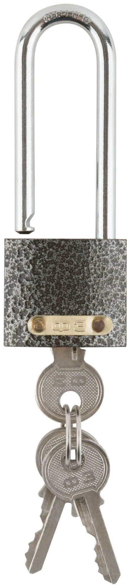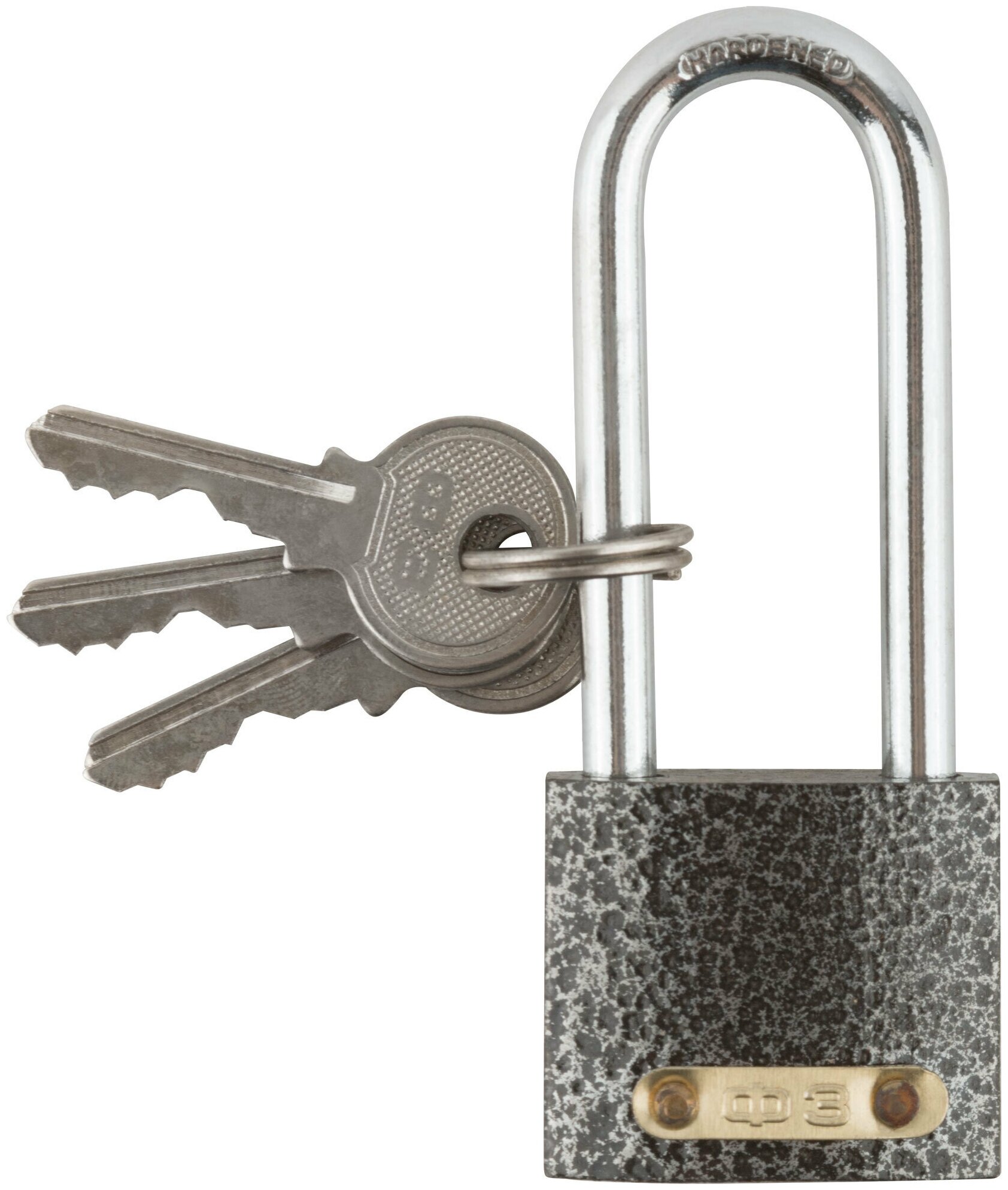 Замок навесной Фабрика замков серии 303F. Корпус замка выполнен из чугуна, автоматическое запирание, закаленная дужка. В комплекте поставки: замок навесной, 3 английских ключа.