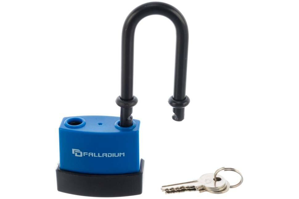 Всепогодный навесной замок с длинной дужкой. Прекрасно работает в любую погоду благодаря водонепроницаемой конструкции. Высокий проем дужки позволяет завести замок через высоко приваренные расположенные или широко расставленные петли.