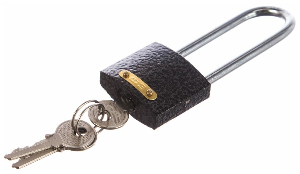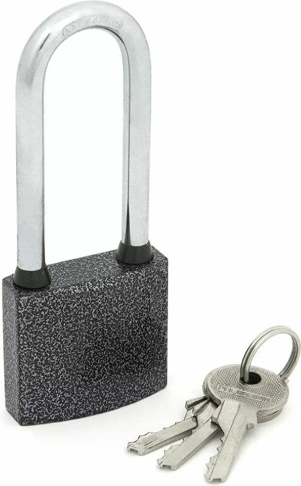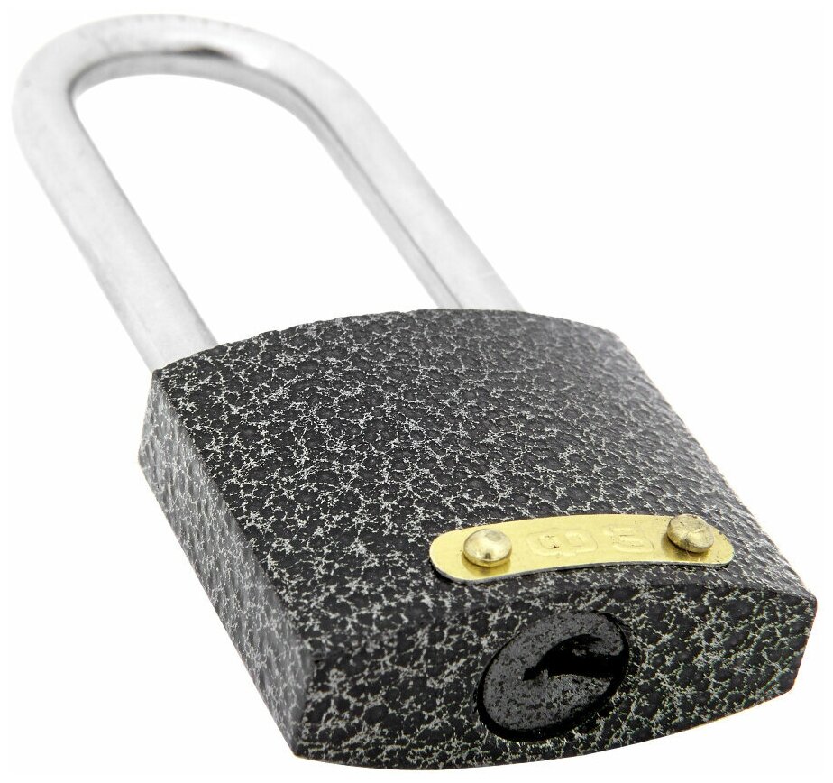 Классический висячий замок средних размеров. Кейс с инструментами, дверца металлического ящика или щитка - куда только не вешают этот амбарный замок.