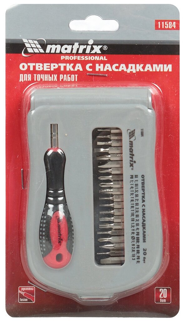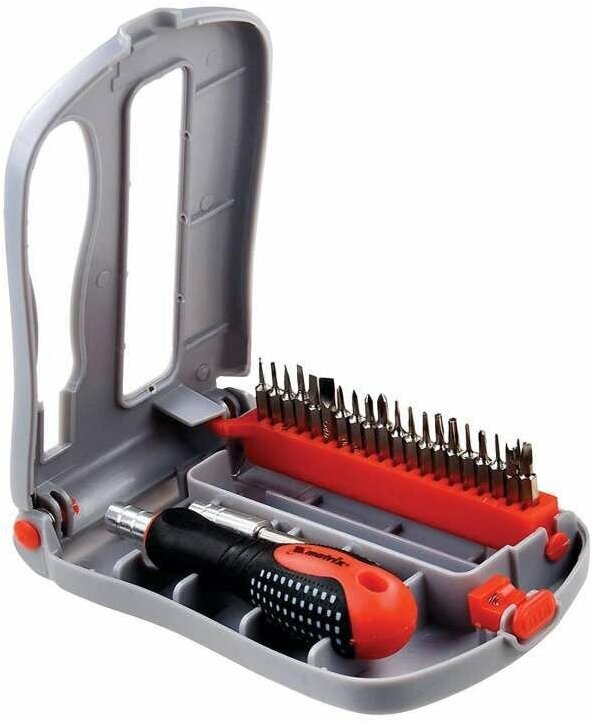 Отвертка Matrix предназначена для выполнения прецизионных работ по ремонту и обслуживанию мобильных телефонов, часов, пейджеров, ноутбуков и другой электронной техники. В состав набора входит эргономичная двухкомпонентная рукоять с гнездом для сменных бит, переходник-битодержатель и 20 бит. Набор упакован в пластиковый кейс для хранения и переноски.