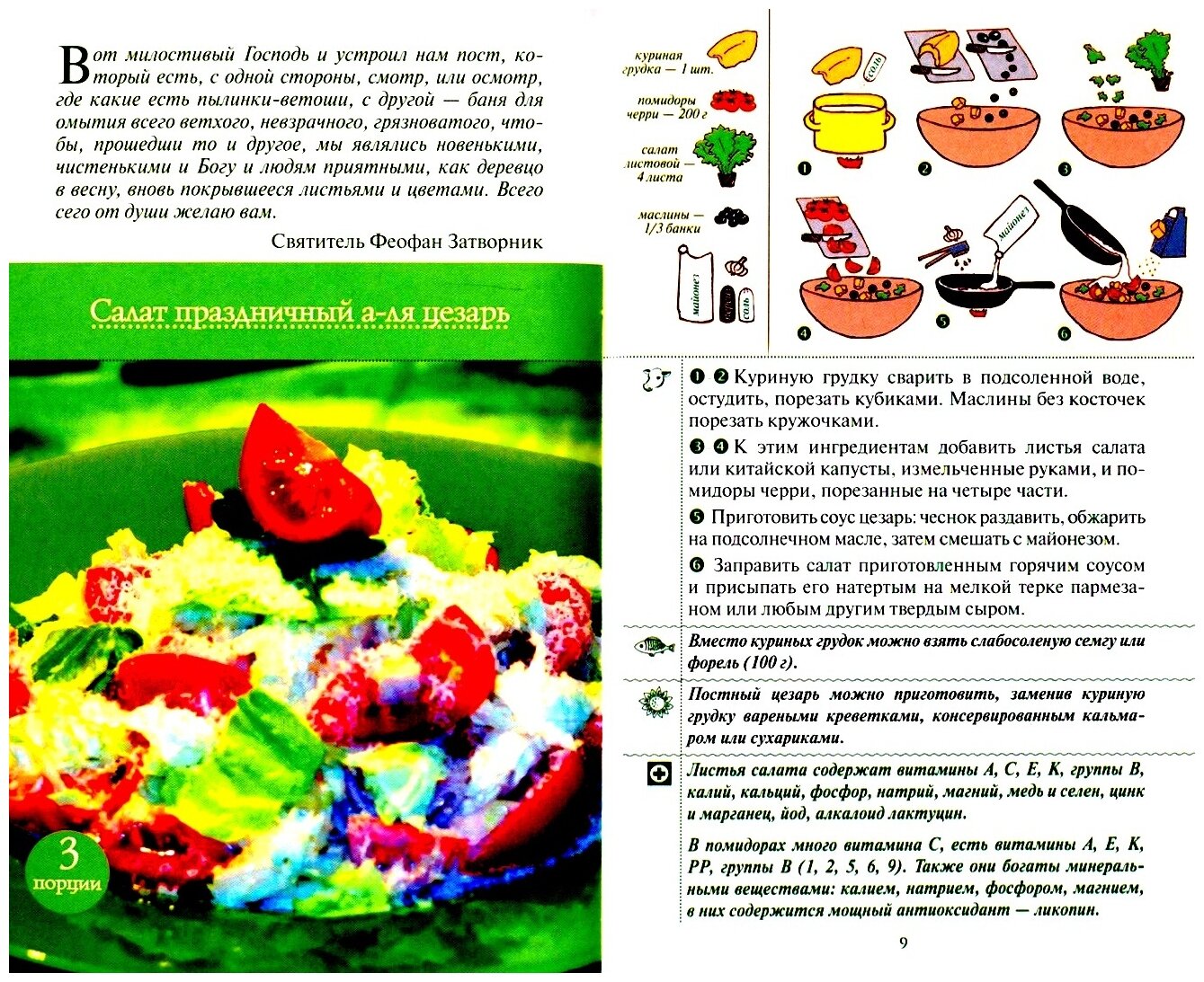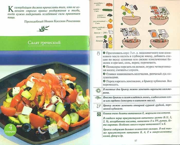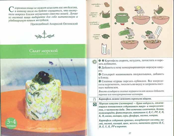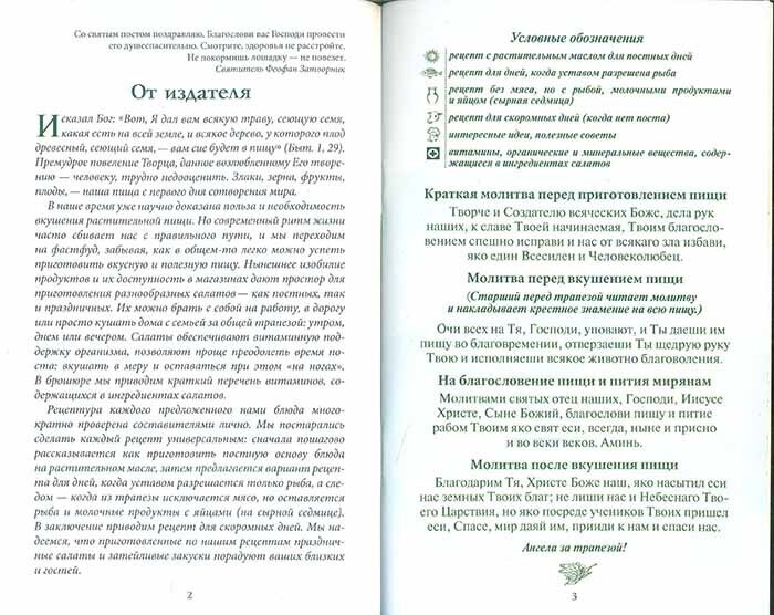 Рецептура каждого предложенного нами блюда многократно проверена составителями лично. Мы постарались сделать каждый рецепт универсальным: сначала пошагово рассказывается как приготовить постную основу блюда на растительном масле, затем предлагается вариант рецепта для дней, когда уставом разрешается только рыба, а следом - когда из трапезы исключается мясо, но оставляется рыба и молочные продукты с яйцами (на сырной седмице). В заключение приводим рецепт для скоромных дней. Мы надеемся, что приготовленные по нашим рецептам праздничные салаты и затейливые закуски порадуют ваших близких и гостей.