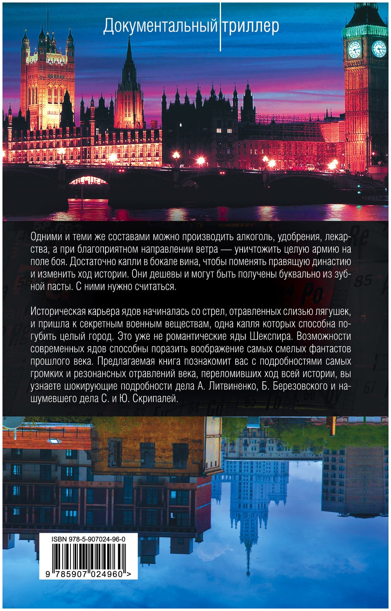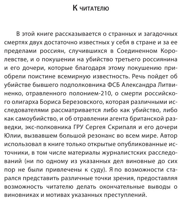 Я даю вам горькие пилюли в сладкой оболочке. Сами пилюли безвредны, весь яд - в их сладости. (С. Ежи Лец) Одними и теми же составами можно производить алкоголь, удобрения, лекарства, а при благоприятном направлении ветра - уничтожить целую армию на поле боя. Достаточно капли в бокале вина, чтобы поменять правящую династию и изменить ход истории. Они дешевы и могут быть получены буквально из зубной пасты. С ними нужно считаться. Историческая карьера ядов начиналась со стрел, отравленных слизью лягушек, и пришла к секретным военным веществам, одна капля которых способна погубить целый город. Это уже не романтические яды Шекспира. Возможности современных ядов способны поразить воображение самых смелых фантастов прошлого века. Предлагаемая книга познакомит вас с подробностями самых громких и резонансных отравлений века, переломивших ход всей истории, вы узнаете шокирующие подробности дела А. Литвиненко, Б. Березовского и нашумевшего дела С. и Ю. Скрипалей.