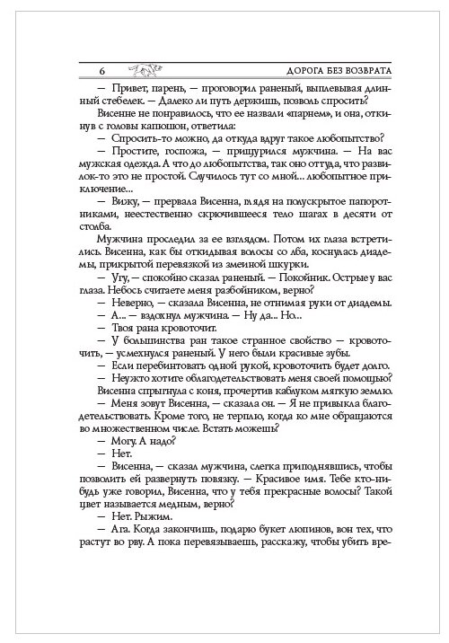 Нежданно-негаданно увидел "Дорогу без возврата" из этой серии в рекламе, пришлось покупать для коллекции. Оформление идентично предыдущим книгам серии, в меру плотная белая офсетная бумага, крупный шрифт, приличное качество печати. Напечатано, кстати, в "Первой образцовой типографии", которая начинала как действительно образцовая, но теперь регулярно скатывается на уровень "Парето-принт".