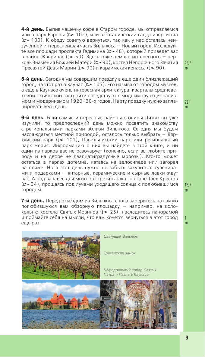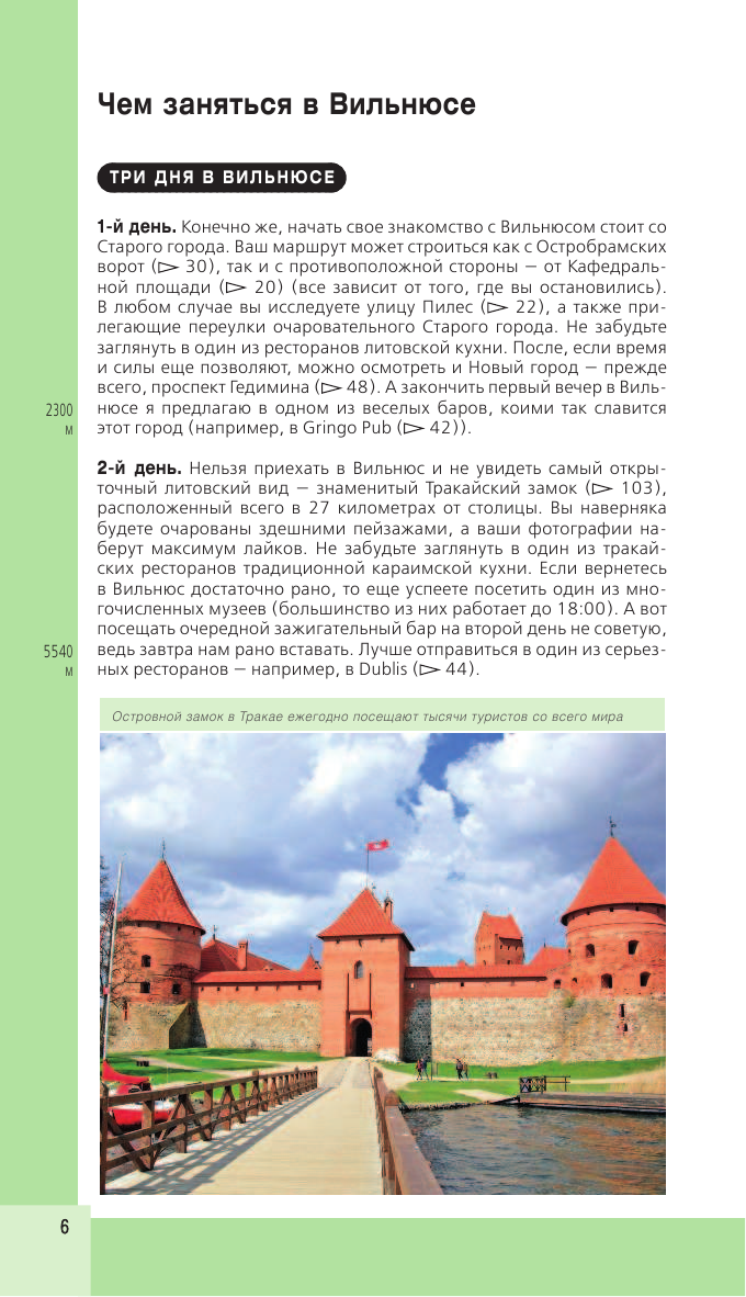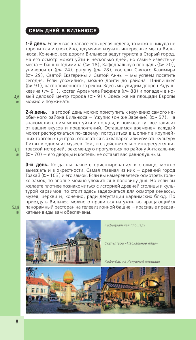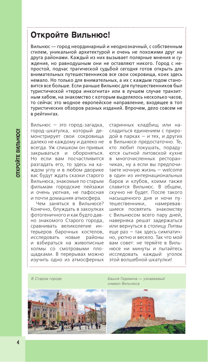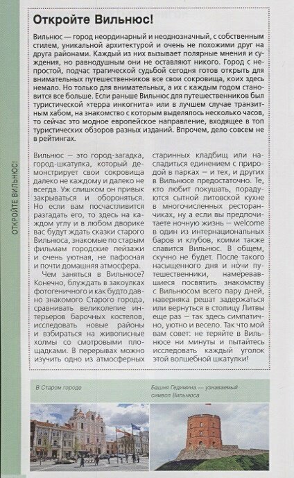 Это моя любимая серия путеводителей. Тонкие, легкие, но при этом очень информативные и богато иллюстрированные. Описание и история достопримечательностей сопровождаются яркими фотографиями. В этом путеводителе есть вся основная информация, необходимая туристу. Традиционно есть информация о работе музеев, о транспорте, ресторанах и развлечениях. Кроме этого, в путеводителе есть краткий обзор истории Вильнюса и приятный бонус - статья про литовскую кухню. Мне очень понравился стиль изложения. Автор представил читателям Вильнюс как "город-загадку" и сравнил со шкатулкой, которую хочется открывать снова и снова.
