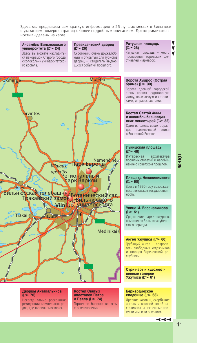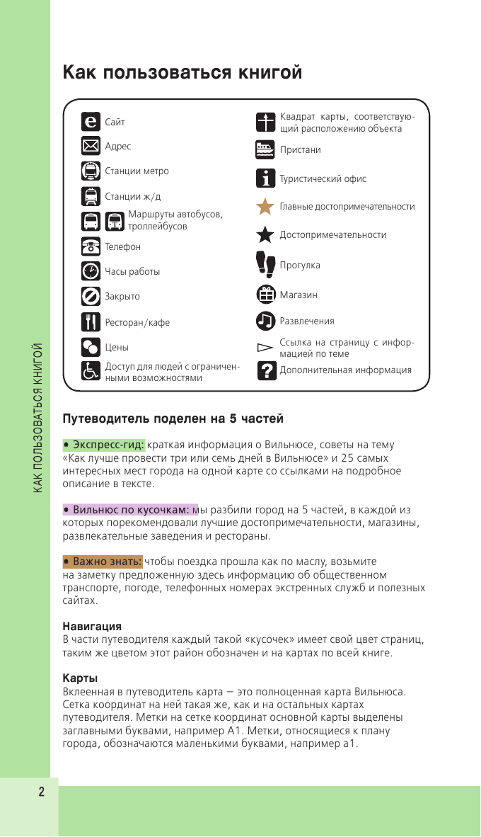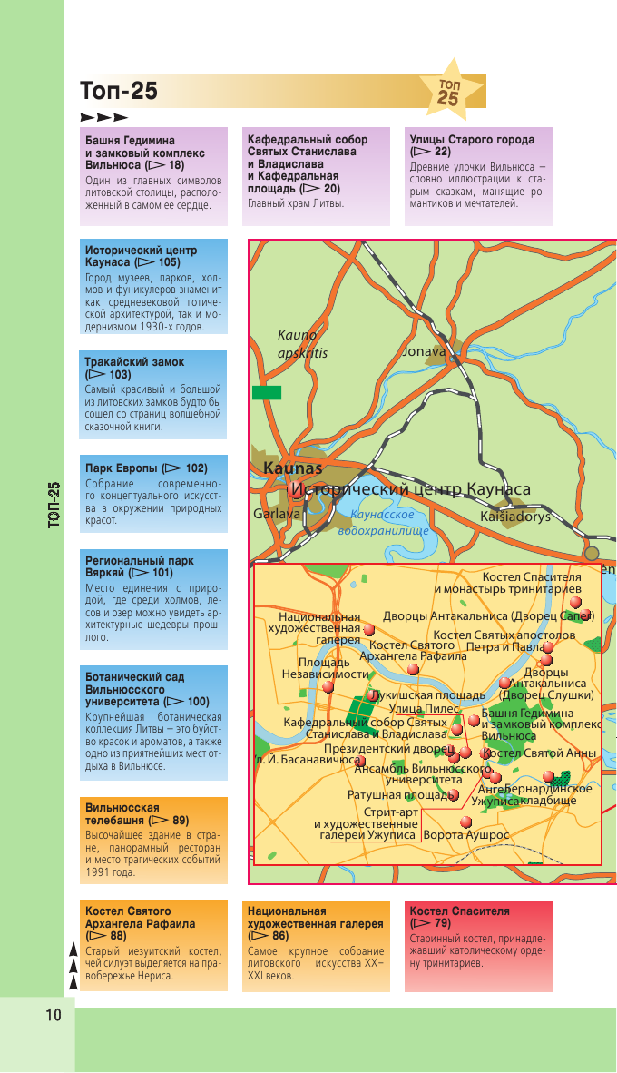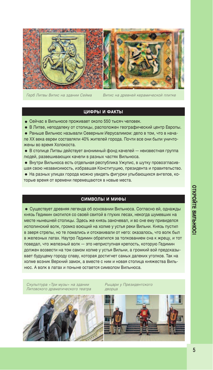 Это моя любимая серия путеводителей. Тонкие, легкие, но при этом очень информативные и богато иллюстрированные. Описание и история достопримечательностей сопровождаются яркими фотографиями. В этом путеводителе есть вся основная информация, необходимая туристу. Традиционно есть информация о работе музеев, о транспорте, ресторанах и развлечениях. Кроме этого, в путеводителе есть краткий обзор истории Вильнюса и приятный бонус - статья про литовскую кухню. Мне очень понравился стиль изложения. Автор представил читателям Вильнюс как "город-загадку" и сравнил со шкатулкой, которую хочется открывать снова и снова.
