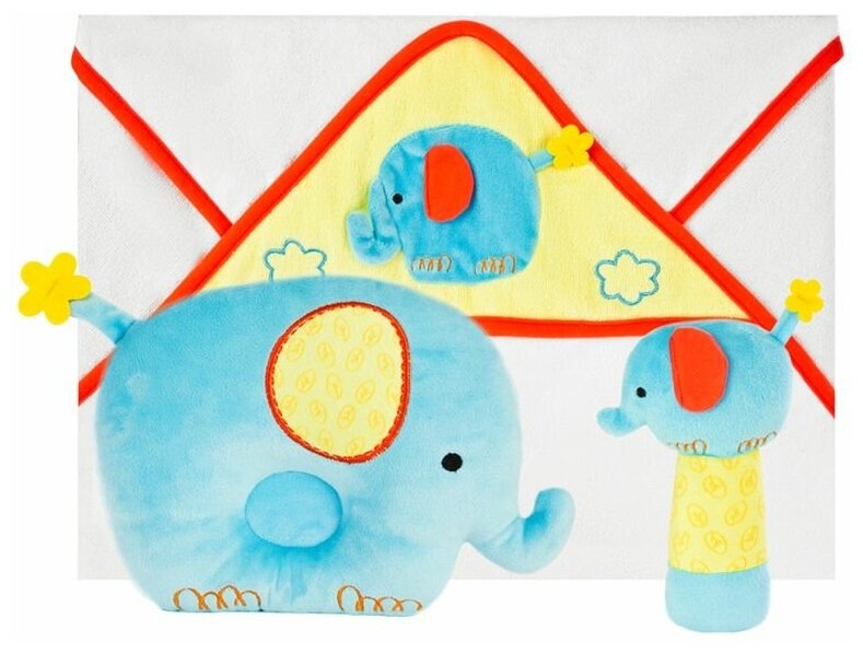 Этот красочный набор станет отличным подарком для малыша с первых дней жизни! В комплекте ? полотенце с принтом в виде симпатичного слоника, очень приятное на ощупь, мягкая подушка-слонёнок и весёлая погремушка-слоник. Полотенце сделано из натурального 100% хлопка. Набор упакован в прозрачную сумочку с ручкой.