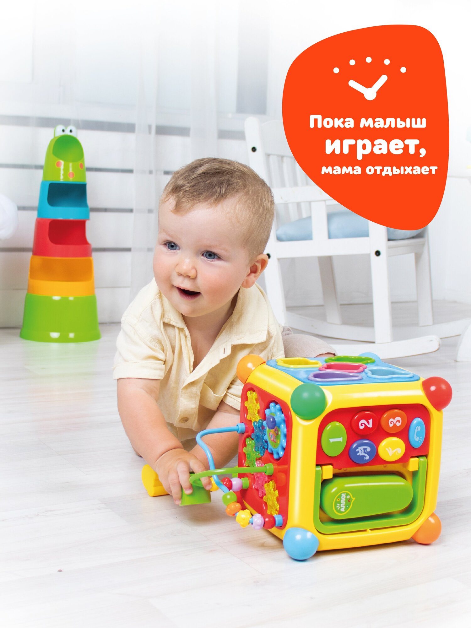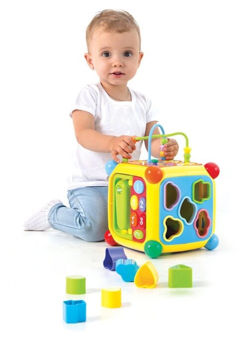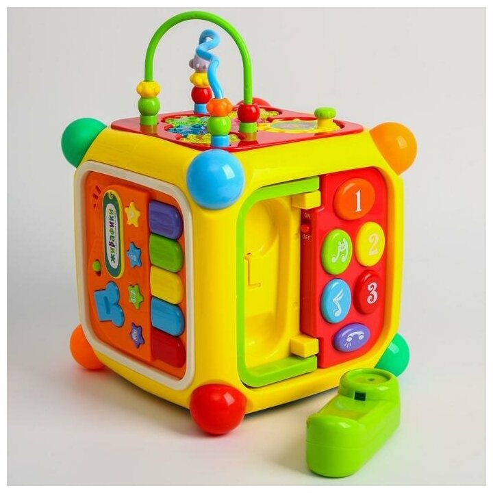 Это настоящий многофункциональный игровой центр! На каждой стороне куба - разные развивающие игры. На двух сторонах расположены сортеры - фигурные отверстия, через которые малыш должен протолкнуть внутрь куба фигурные элементы. На третьей стороне - игрушка-лабиринт с разноцветными колечками и шестеренки, которые можно вращать. Четвертая сторона - это телефон для малышей с большими кнопками. Игра с телефоном сопровождается различными звуками и мелодиями, звук включается с помощью кнопки on / off , расположенной на этой же стороне. Здесь же есть складная ручка для переноски куба. Пятая сторона - музыкальное пианино со своим отдельным переключателем питания on / off . У пианино - пять клавиш разного цвета и четыре функциональных кнопки с изображением музыкальных инструментов. При нажатии на функциональные кнопки звучание пианино становится похожим на звучание соответствующего музыкального инструмента. Еще одна кнопка в виде ноток, расположенная здесь же, включает режим проигрывания мелодий. Шестая сторона - это дверца, с помощью которой куб можно открывать. Дверца открывается ключиком, присоединенным к этой же стороне с помощью веревочки.