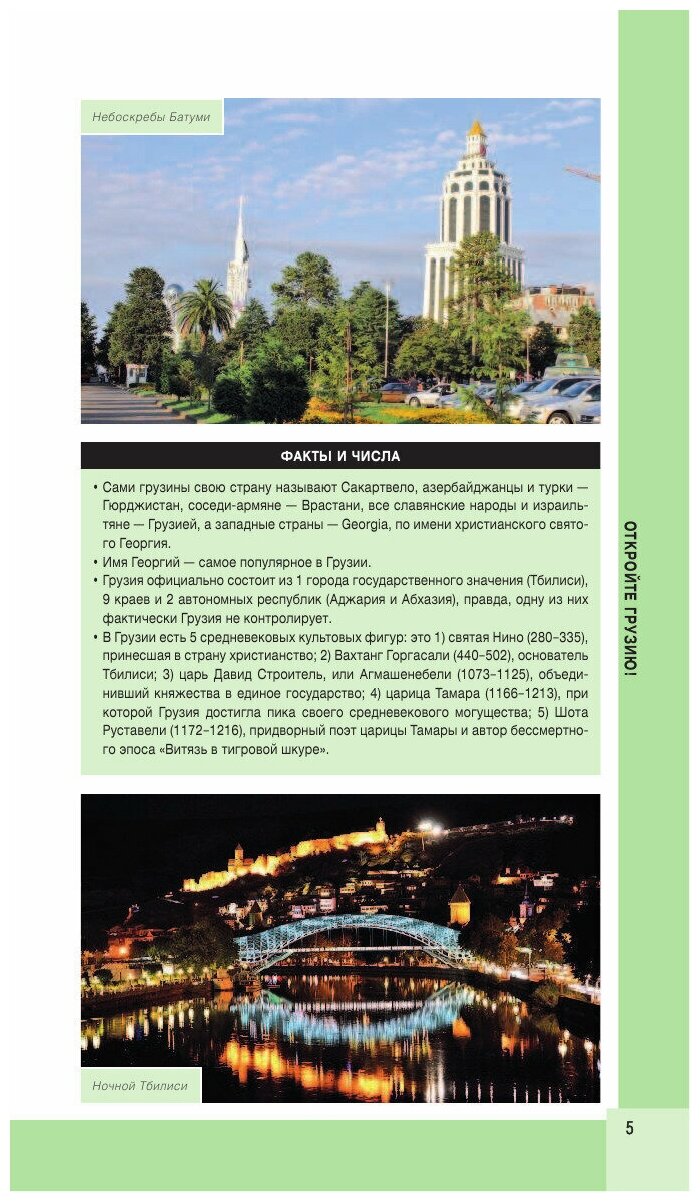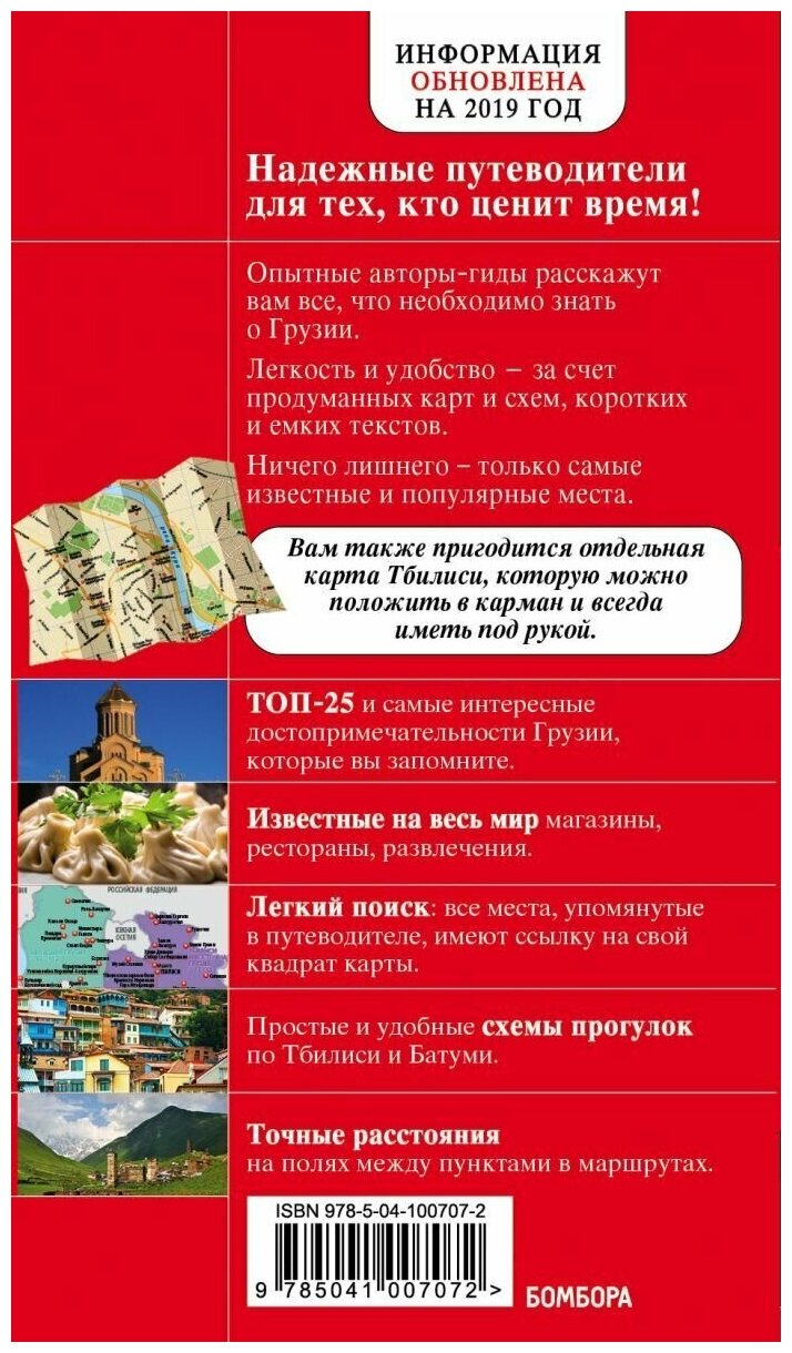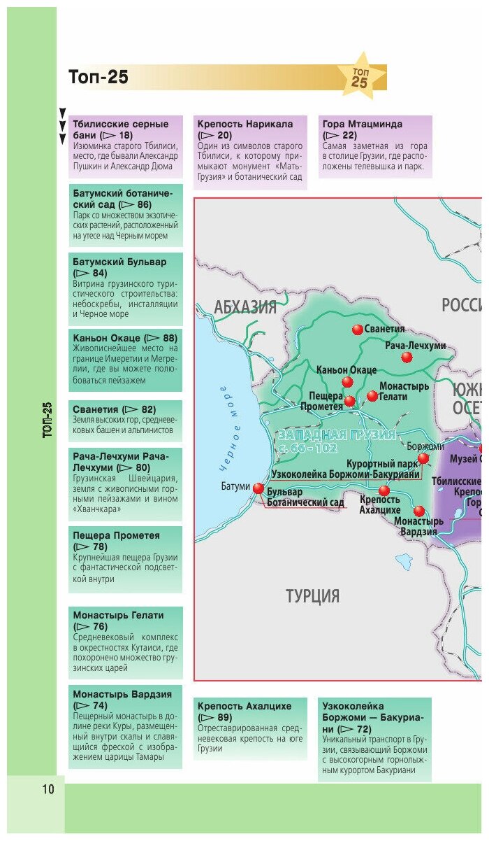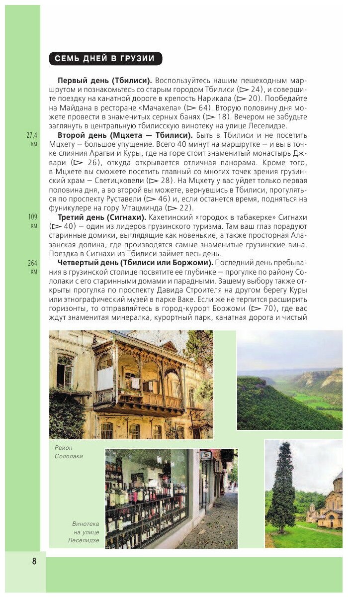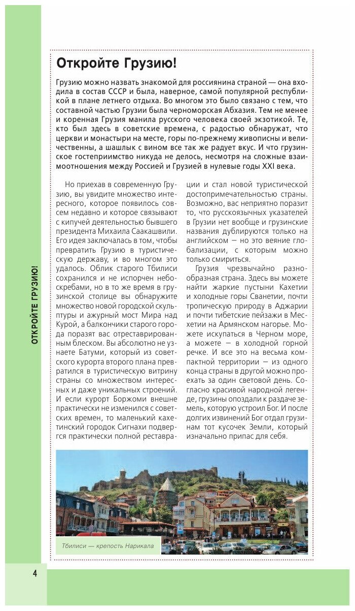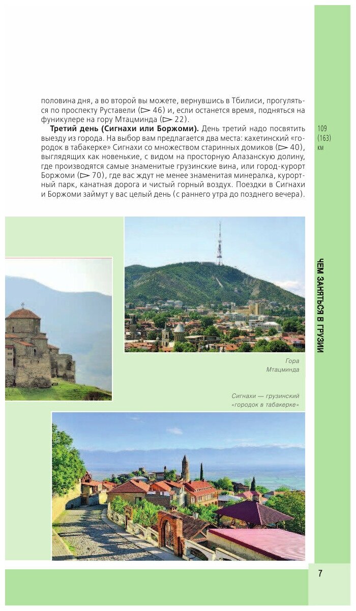 Не соглашусь с предыдущим отзывом. Путеводитель понравился: много информации, все актуально и полезно. Отсыл к СССР не так уж и неуместен - сами пожилые грузины в разговорах напоминают о тех временах, когда мы были вместе. Наши желания совпали с советом посетить за 3 дня Тбилиси, Мцхету и Боржоми, и не могу сказать, что Боржоми - плохая идея. Поездка у нас заняла 10 часов (от вокзала Дидубе), из них в Боржоми провели 6 часов. Дорога в одну сторону на маршрутке около 2 часов. Природный парк с источниками, горной рекой и бассейнами под открытым небом - хорошее разнообразие после многочисленных храмов и городских экскурсий. Недостаток путеводителя - хотелось непосредственно на карте города видеть и станции метро, приходилось пользоваться дополнительной картой