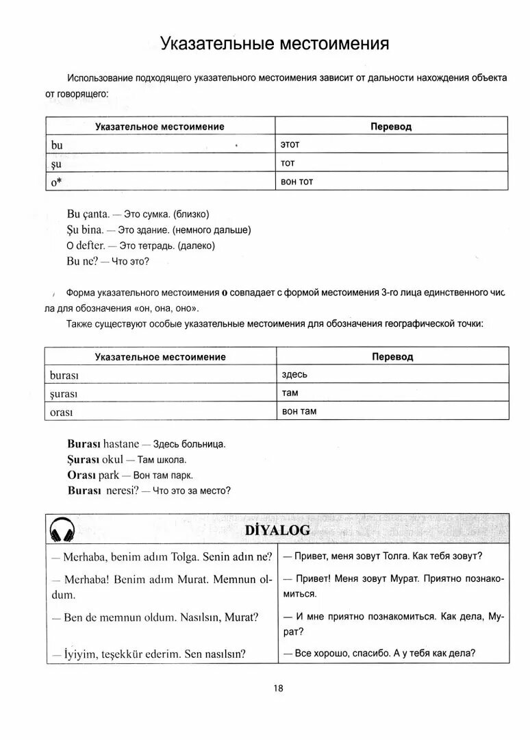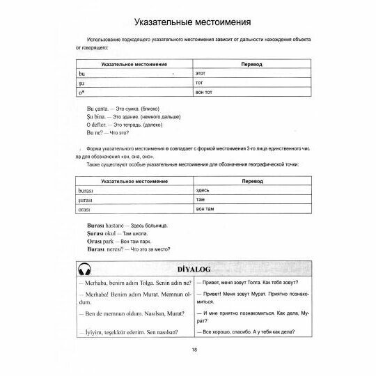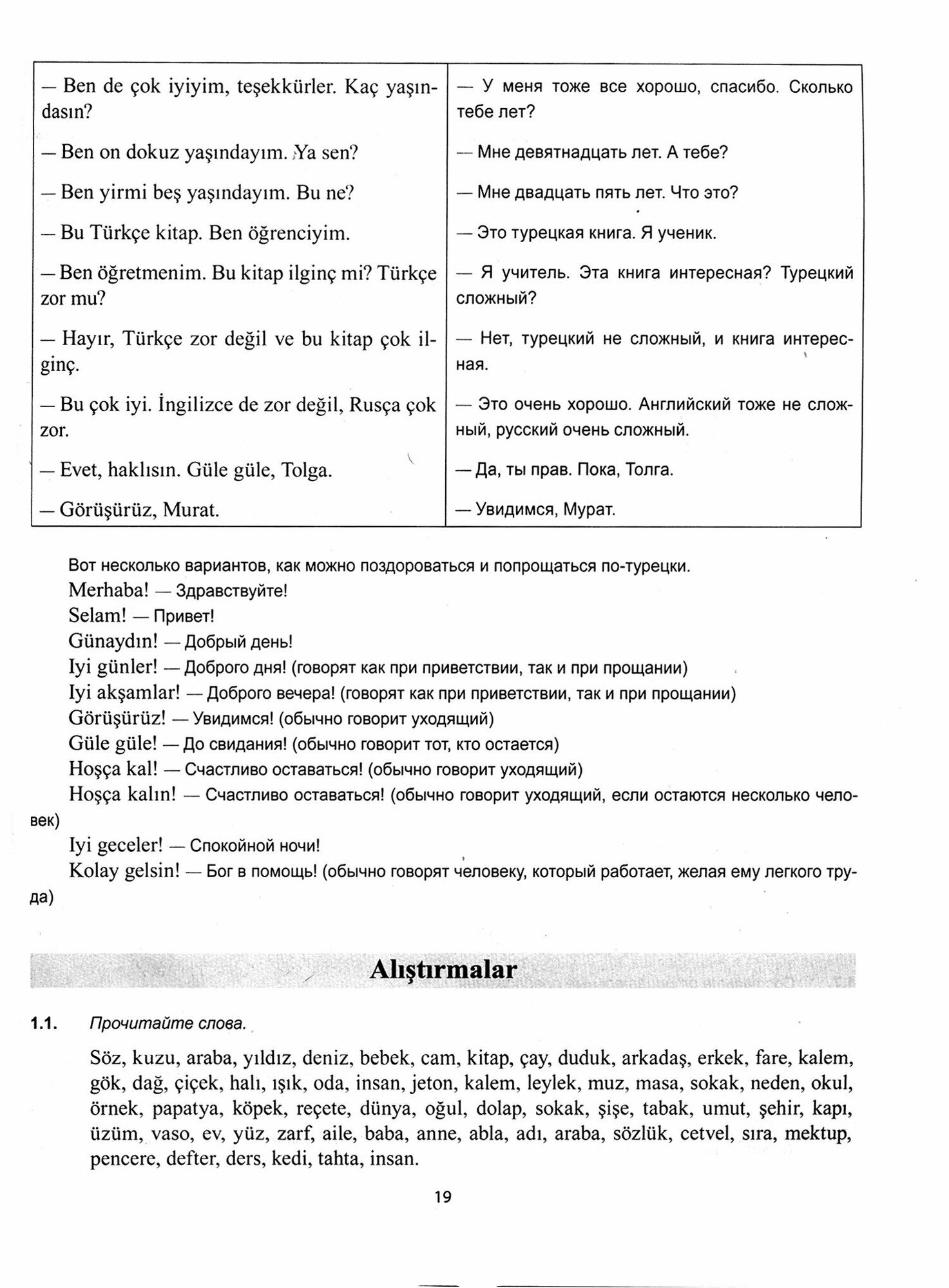 К сожалению, быстро стало ясно, что для качественного самостоятельного изучения турецкого языка пособие не годится абсолютно. Во-первых, автор некоторые вещи почему-то не считает нужным разъяснять. Например, с первых же уроков регулярно упоминается закон сингармонизма, но не разъясняется, что это, хотя а) это важно для турецкого языка, это основа его звучания и фактор, влияющий на образование большинства грамматических конструкций; б) разъяснение заняло бы не больше полстраницы. Во-вторых, формулировки настолько краткие и сухие, что часто либо их недостаточно, и приходится добирать информацию в других источниках, либо они вообще больше запутывают, чем разъясняют. В-третьих, уже непосредственно из предисловия вы узнаете, что есть аудиоприложение с диалогами, которое покупается отдельно. Не понимаю, в чём проблема сразу давать его в комплекте, подняв цену, или хотя бы упомянуть о нём в аннотации, чтобы человек мог одновременно заказать и учебник, и CD-диск (правда, не уверена, что этот устаревший формат многих устроит).