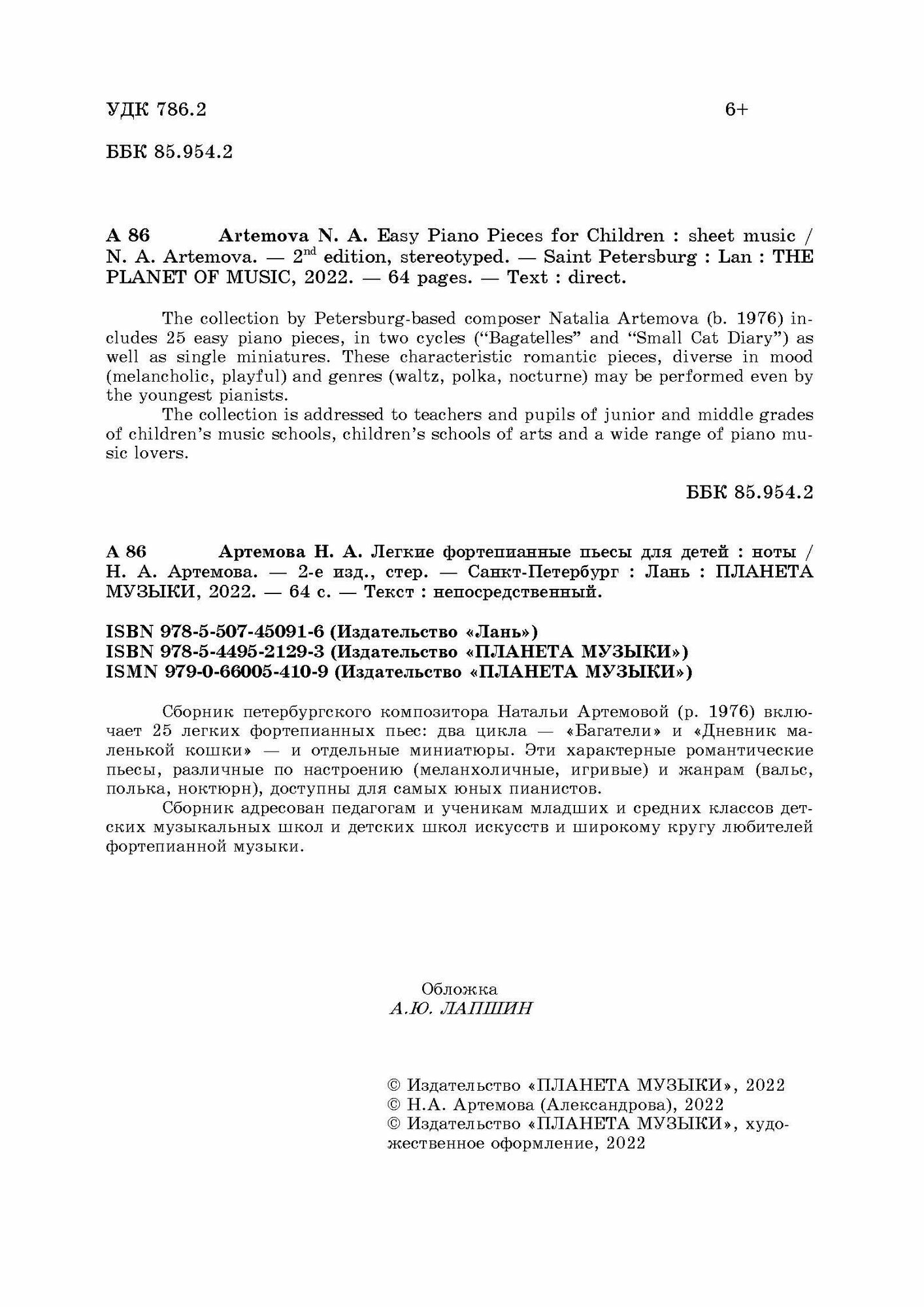 Легкие фортепианные пьесы для детей. Ноты (Артемова Наталья Александровна); Планета музыки, 2022