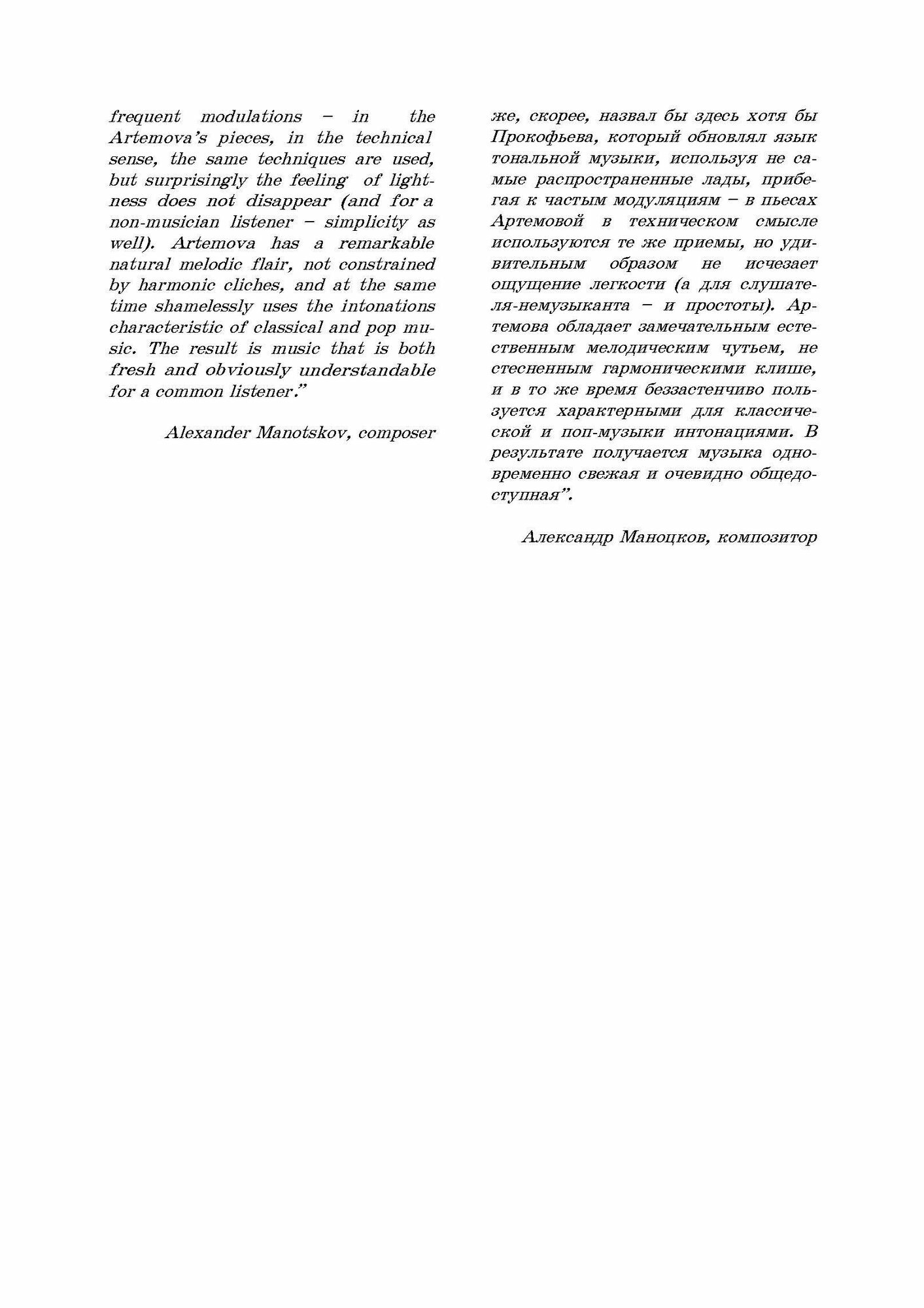 Сборник петербургского композитора Натальи Артёмовой включает 25 легких фортепианных пьес: два цикла - "Багатели" и "Дневник маленькой кошки" - и отдельные миниатюры. Эти характерные романтические пьесы, различные по настроению (созерцательные, игривые) и жанрам (вальс, полька, ноктюрн), доступны для самых юных пианистов.