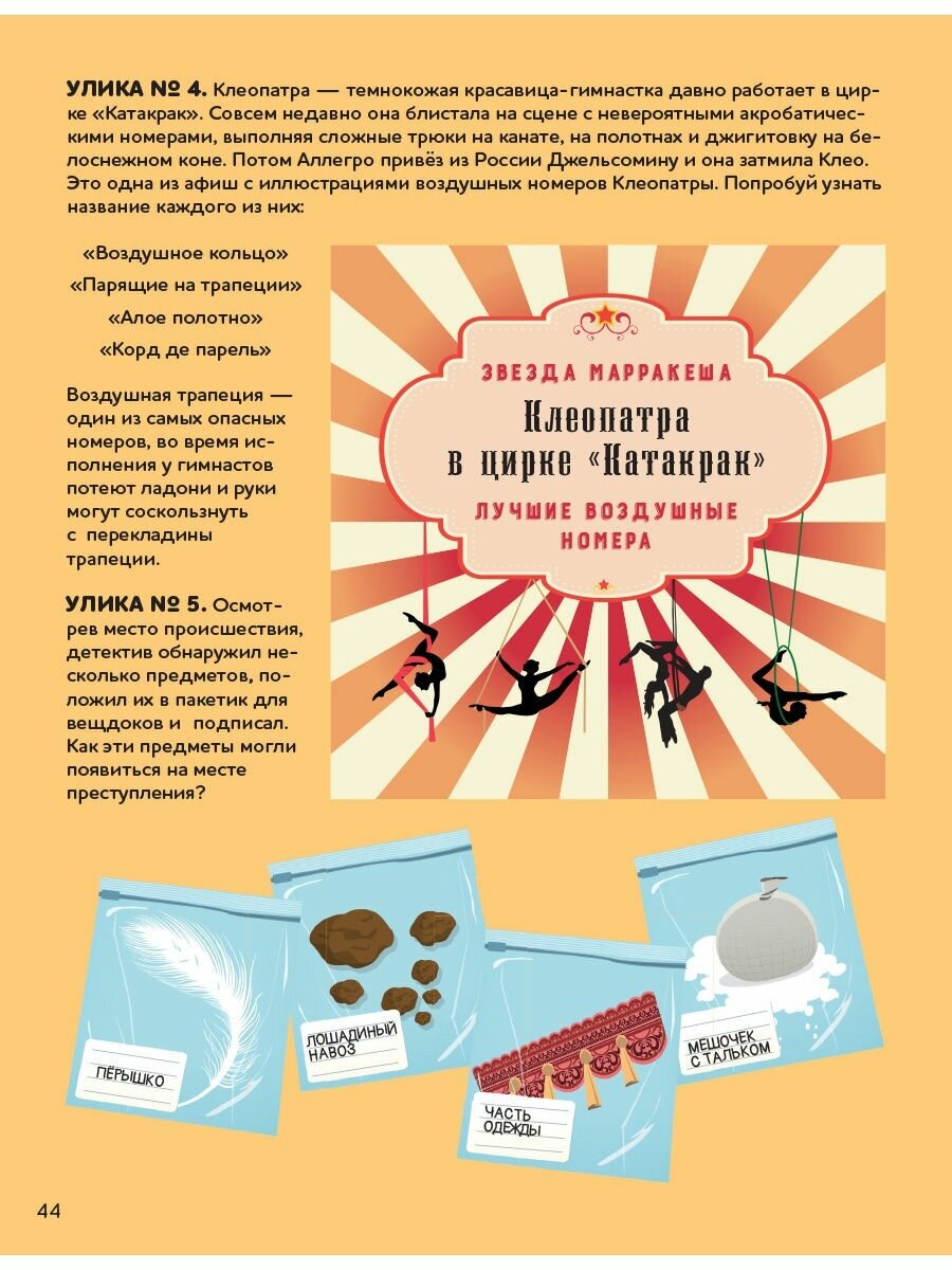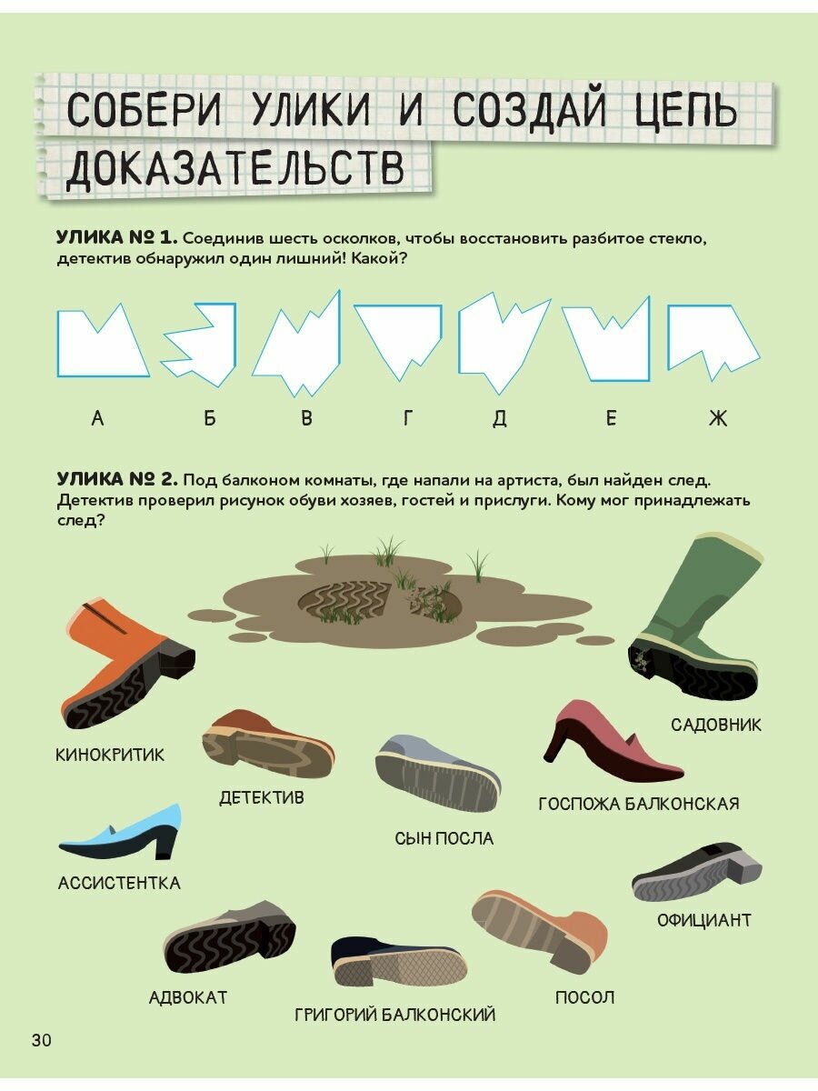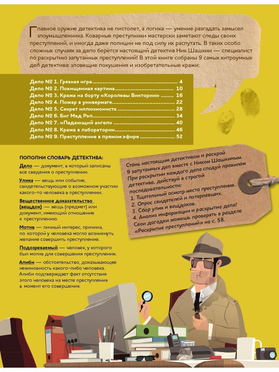 "Настоящий детектив Ник Шашкин" предлагает вам раскрыть 9 совершенно хитроумных дел, тщательно осматривая место преступления, опрашивая свидетелей, собирая улики и анализируя информацию. Дела довольно непростые. При анализе улик как обычно выясняется, что все подозреваемые нервничают, вокруг полно странных предметов, а еще обнаруживается зашифрованное сообщение. Однако, по мере проведения расследования, всё становится почти понятно. Особенно, если воспользоваться подсказками в конце книги. :) Если же не использовать подсказки, а пытаться решить все самим, то задания довольно сложные и запутанные, даже на мой взрослый взгляд. Поэтому рекомендации по возрасту — лет с 10-ти. Если ваш ребенок увлечен детективами и расследованиями, обожает головоломки и мечтает о славе Шерлока Холмса — эта книга подойдет для него идеально.