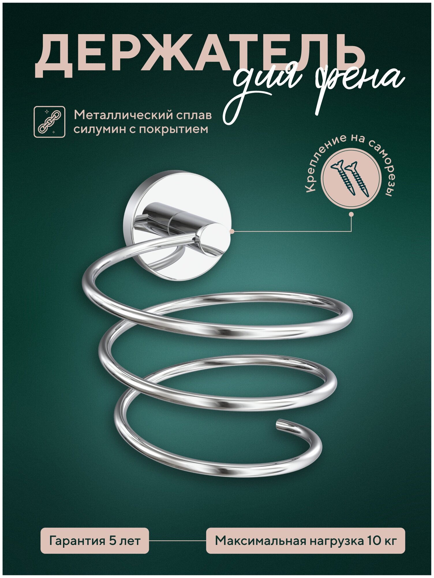 Ищете умное решение для экономии места в ванной комнате? Держатель для фена от бренда Fora - полезный аксессуар, благодаря подвесной спиралевидной конструкции держателя фен всегда находится в удобном месте, не занимает пространство на полках, а его шнур не запутывается и не перекручивается. Держатель для фена в ванную изготовлен из высокопрочного металлического сплава, устойчивого к коррозии и механическим повреждениям, легко протирается и моется. Аксессуар надежно фиксируется к стене при помощи саморезов и выдерживает до 10 кг статичной нагрузки. Держатель позволяет хранить фен на весу, экономя место в помещении, а благодаря подвесной конструкции держателя шнур фена не перегибается и служит дольше. Лаконичный дизайн изделия вписывается в убранство любой ванной комнаты. Для создания гармоничности дополните интерьер другими современными аксессуарами коллекции от Fora.