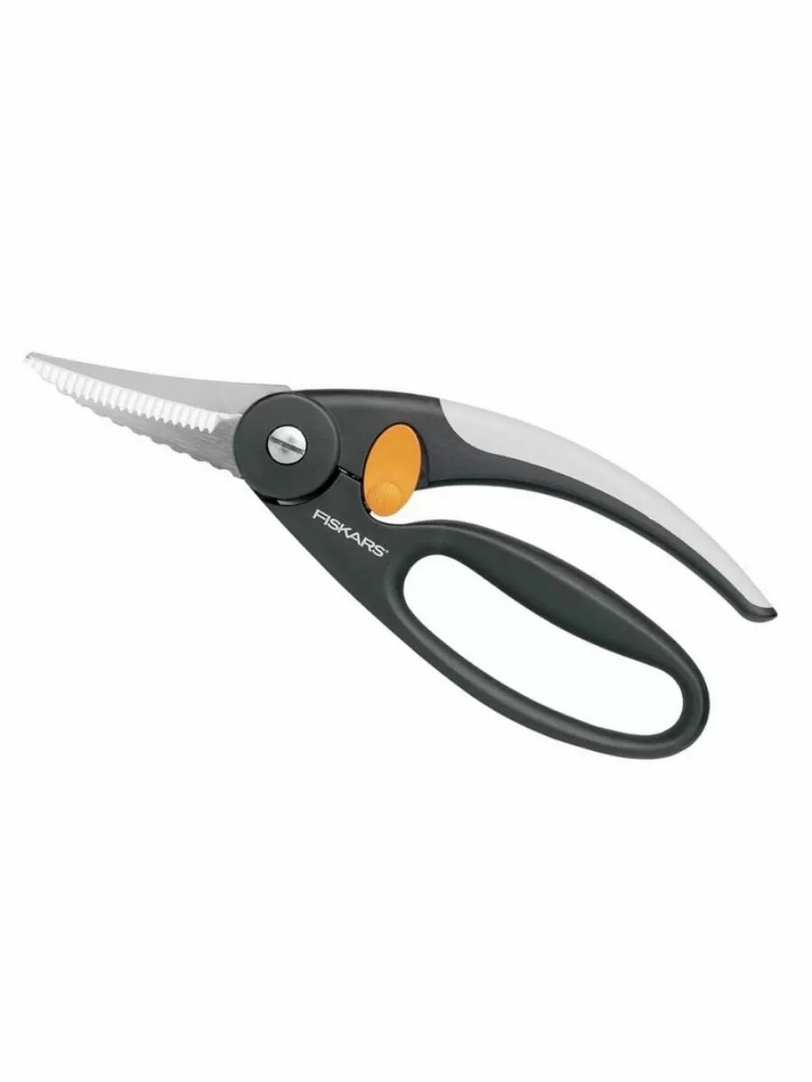Прочные изогнутые ножницы с зазубренным лезвием для разделки и обработки рыбы. Ручки ножниц с мягким захватом подходят как для правшей, так и для левшей. Механизм блокировки включается большим пальцем. Натяжение лезвий регулируется с помощью винта.