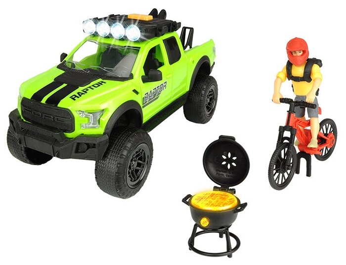 Набор велосипедиста торговой марки Dickie, игровой серии PlayLife. В комплекте: внедорожник Форд Raptor со свободным ходом, фигурка, горный велосипед, барбекю с подсветкой, аксессуары. Световые и звуковые эффекты.