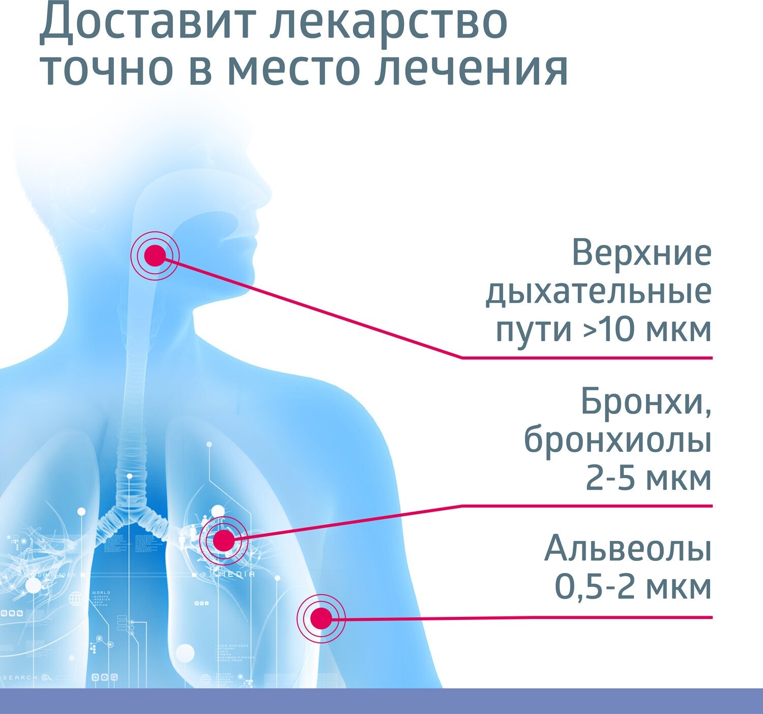 | Размер частиц | от 0,5 до 5 микрон; Средний размер частиц аэрозоля (MMAD - Mass Median Aerodynamic Diameter, аэродинамический диаметр частиц средней массы)3.16 микрон. |