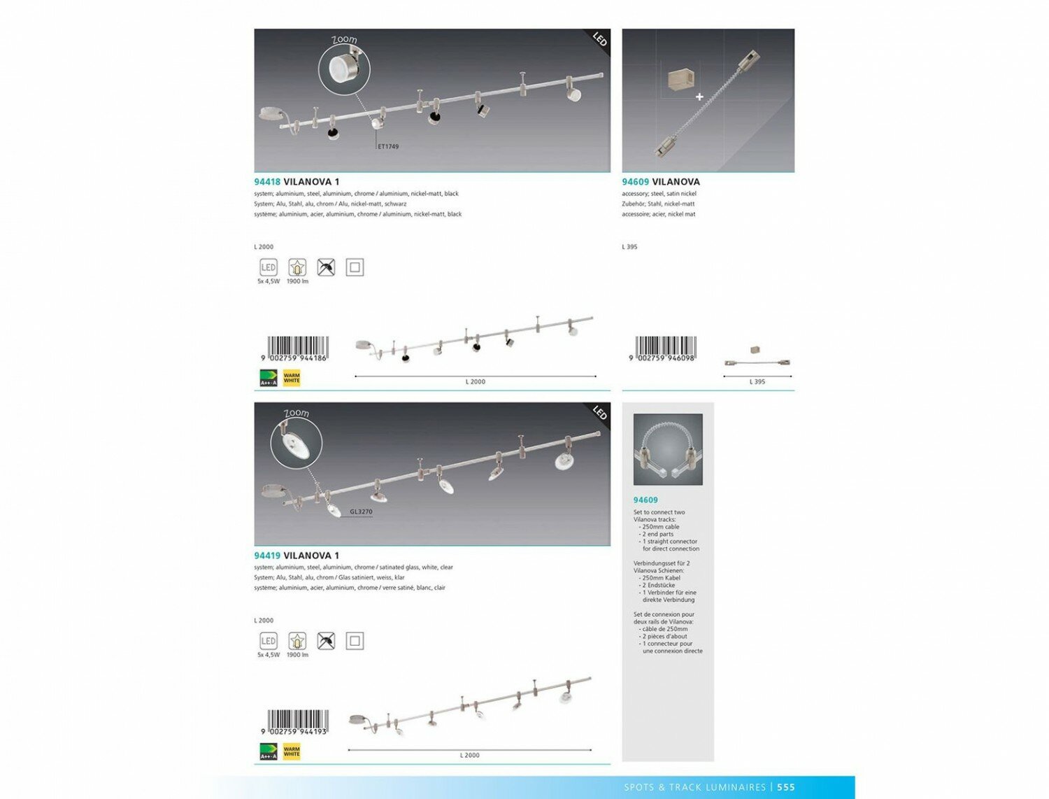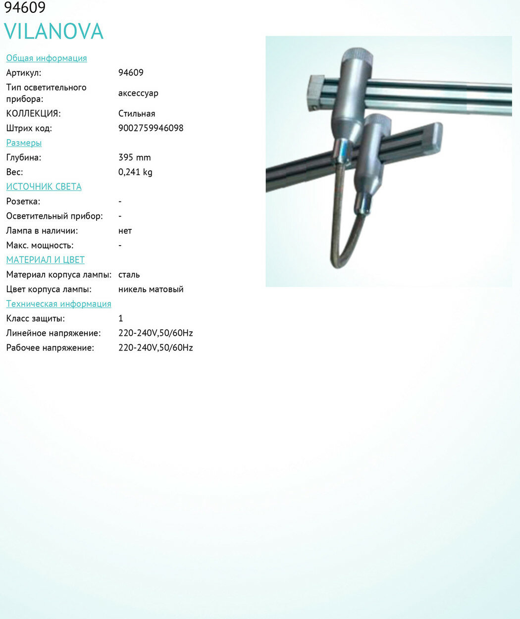 Аксессуар для треков Eglo серии VILANOVA. Придаст особый шарм вашему интерьеру. Длина 39.5 cm. Параметры пылевлагозащиты IP — 20. Материал/цвет арматуры сталь/никель. Страна происхождения бренда — АВСТРИЯ.