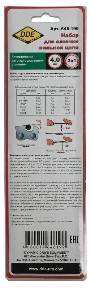 Державка 4,0 мм ручка + напильник 4,0 мм + планка DDE является профессиональным набором для заточки цепей для бензопил. Подходит для заточки цепей с шагом 1/4", 3/8 PMN, 3/8 P.* Компания-производитель оставляет за собой право на изменение комплектации и места производства товара без уведомления дилеров!Указанная информация не является публичной офертой.