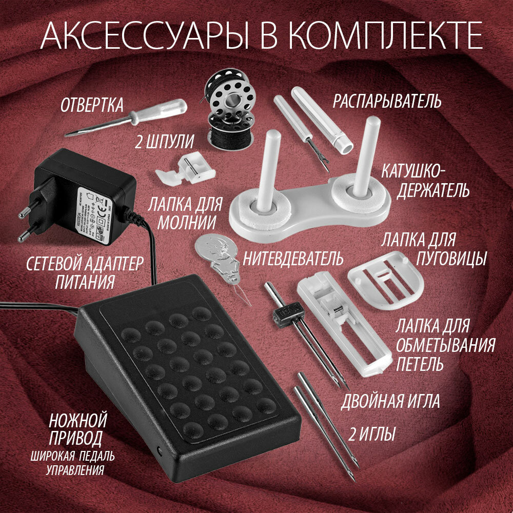 | Комплект поставки | швейная машинка; шпулька - 4 шт; иглы - 2 шт; двойная игла - 1 шт; инструмент для заправки нити; ножной привод; сетевой адаптер питания (12V 1500mA); катушкодержатель; распарыватель; лапка для обметывания петель; лапка для пришивания пуговиц; лапка для пришивания молнии; отвертка; руководство по эксплуатации |