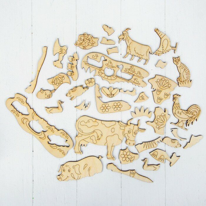 Деревянный пазл Ферма входит в новую серию деревянных пазлов для малышей Собери! Раскрась! Играй! Отличительной особенностью данной серии является то, что ребенок, собирая пазлы, сможет не только познакомиться с окружающим миром (домашние животные и птицы), но и займется творчеством, раскрасив получившуюся картину. Для этого ему нужно будет воспользоваться своими красками или карандашами, которые есть в арсенале каждого ребенка (краски, карандаши, фломастеры и кисточка в набор не входят). Фигурки животных, птиц и растений из набора вырезаны отдельно, и ребенок может использовать их для других игр, которые он придумает сам или вместе со взрослыми. Детали пазла изготовлены из фанеры и вырезаны путем лазерной резки, рисунок нанесен методом лазерной гравировки.