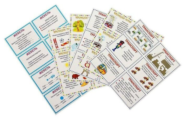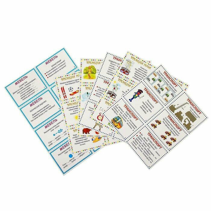 Игра включает в себя 144 карты с вопросами на темы: «Человек», «Профессии», «Времена года», «Транспорт», «Посуда» и «Мебель».