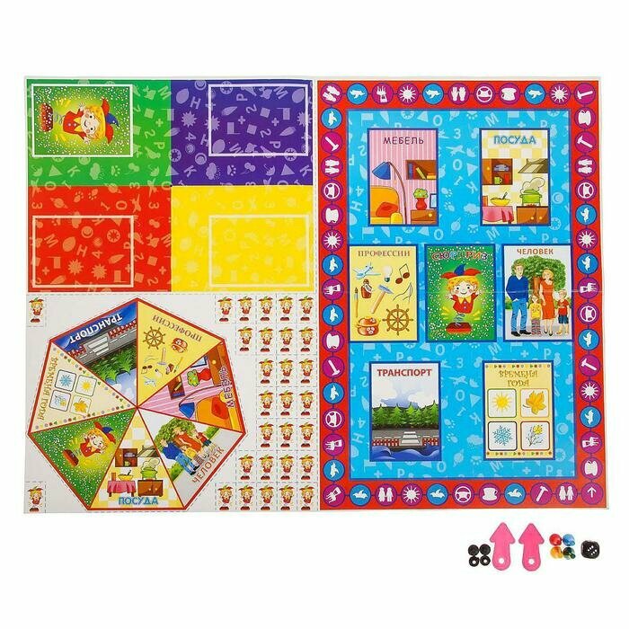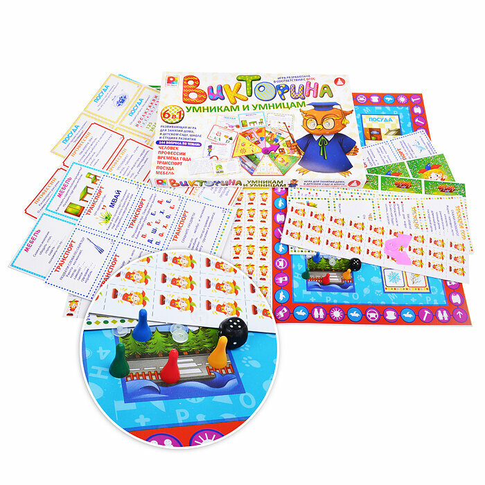 В комплект входят: 144 карточки с заданиями и ответами на оборотной стороне (по 24 вопроса на каждую тему), 3 игровых поля, бонусы за лучшие ответы, игровые стрелки, кубик и фишки.