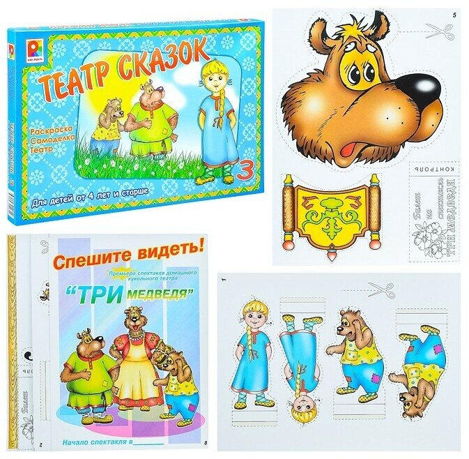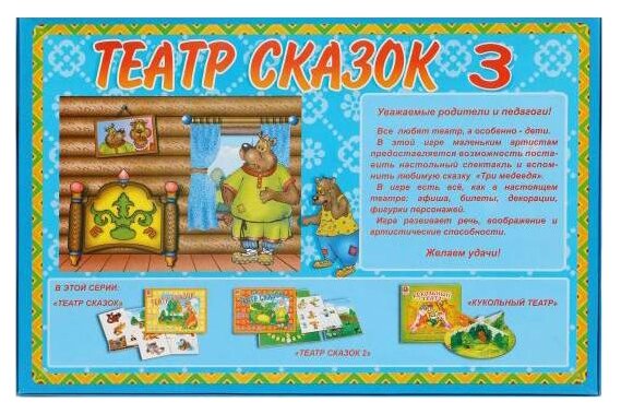 Настольная игра «Театр сказок-3» предлагает маленьким артистам поставить настоящий настольный спектакль и вспомнить любимую всеми сказку «Три медведя». В наборе есть почти все атрибуты настоящего театра: афиша, билеты, декорации и фигурки персонажей. Во время игры ребёнок будет развивать речь, фантазию, воображение и артистические способности. В комплект входят: 10 карточек, 1 правила. Материалы изготовления: бумага, картон. Рекомендованный возраст: 4 года +