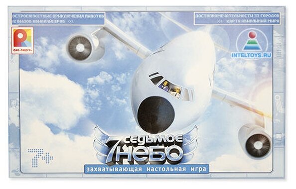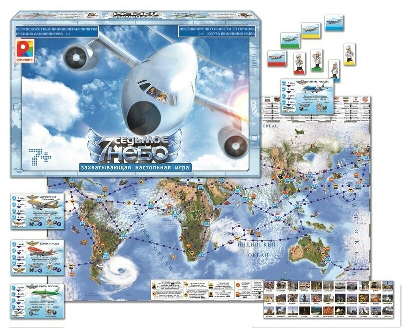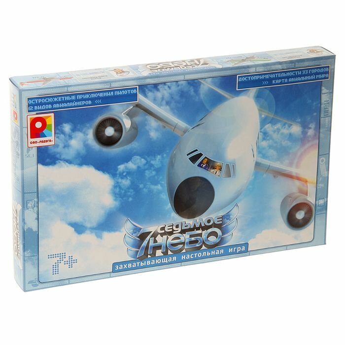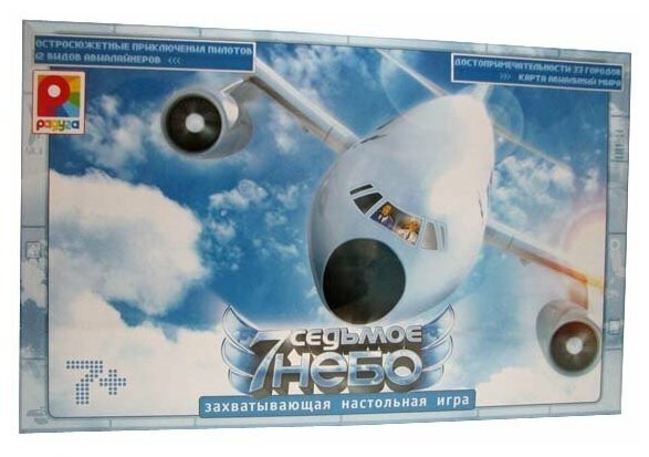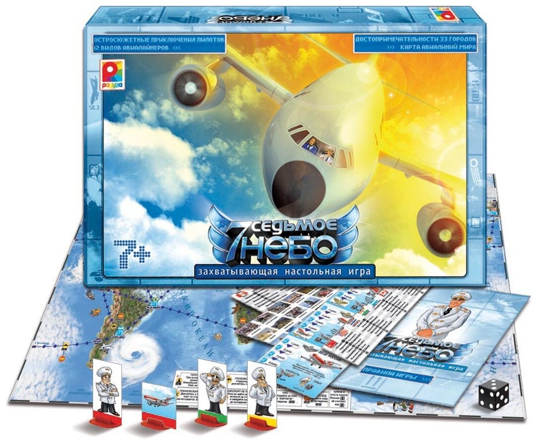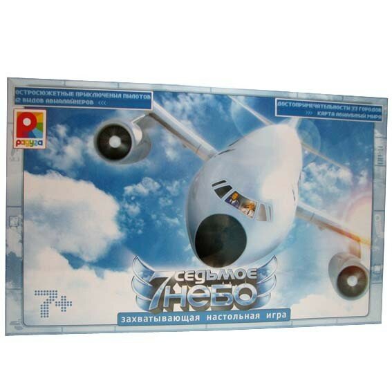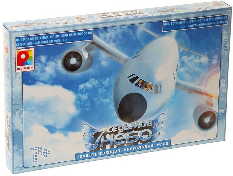 Игра настольная «Седьмое небо» создана российской компанией «Радуга» специально для юных пилотов. Красочно исполненное игровое поле содержит изображение карты мира и маршруты ведущих авиакомпаний. Дети смогут совершить захватывающее путешествие по городам мира и познакомиться с достопримечательностями 33 городов.