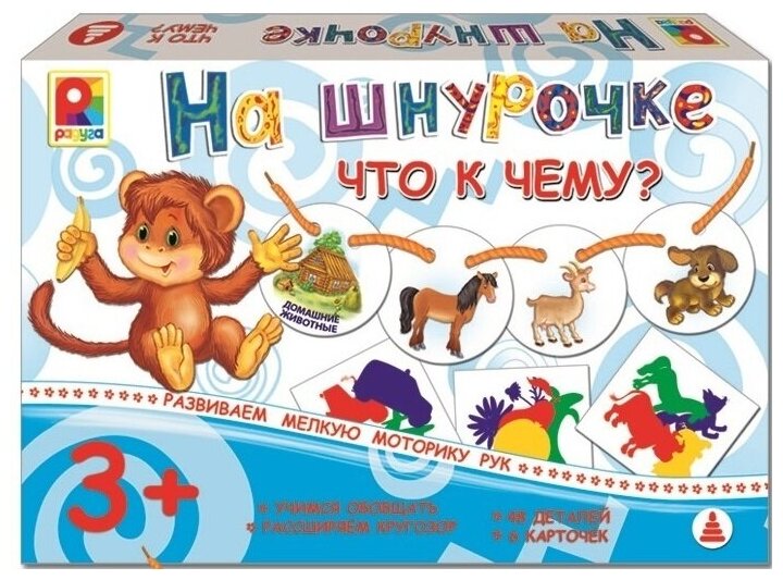 Развиваем мелкую моторику рук и расширяем кругозор с НПИ «На шнурочке. Что к чему?». Игра поможет детям научиться обобщать предметы различных групп (дикие и домашние животные, овощи, фрукты, транспорт, цветы, посуда, мебель). При помощи круглых деталей ребёнку предстоит подобрать предметы одной группы и собрать их на шнурочек. А используя карточки, на шнурок нужно нанизать только те детали, тени которых есть на карточке. В игре предусмотрены и другие развивающие задания. Игра разработана для индивидуальных и подгрупповых занятий с детьми дома, в детских садах и студиях развития. В комплект входят: 48 деталей, 6 карточек, 1 правила, 2 шнурка. Изготовлено из бумаги, картона и текстильных материалов. Рекомендованный возраст: 3 года +