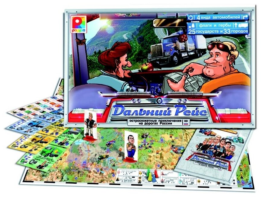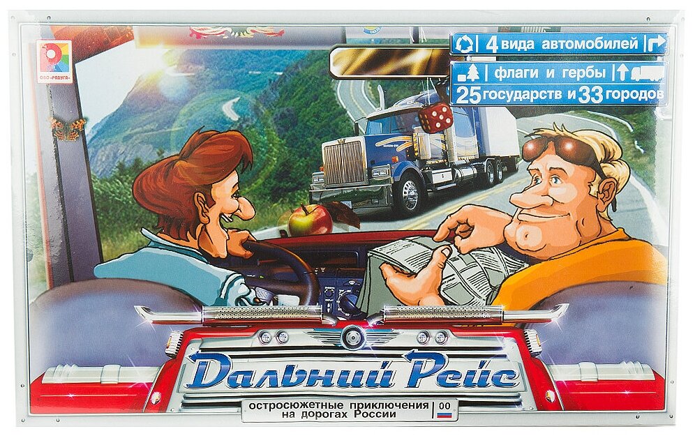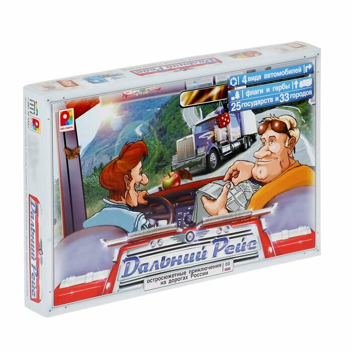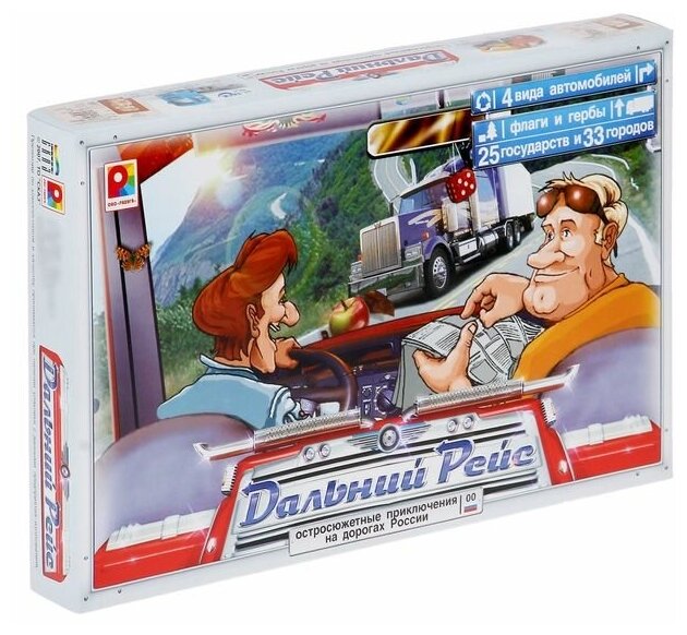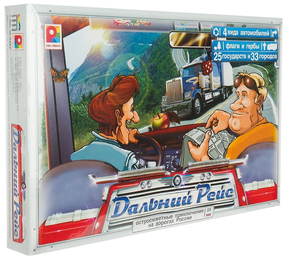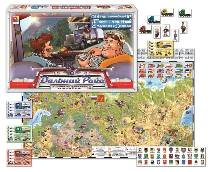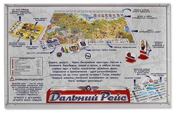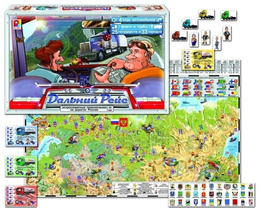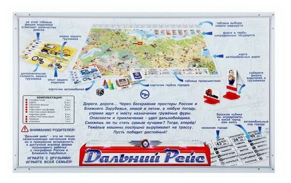 "Проводя время за игрой ""Дальний рейс"", ребенок сможет представить себя водителем-дальнобойщиком, который путешествует по России и граничащим странам и перевозит большие грузы. Путь каждого водителя полон захватывающих приключений и заданий. Игровое поле представлено картой, на которой отмечены все рейсы. Игроку необходимо взять карточки водителя, машины, рейса и выбрать город-точку отправки. Игра полна интересных и увлекательных моментов."