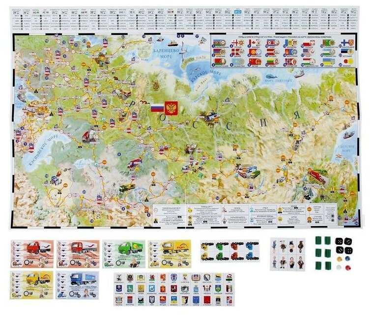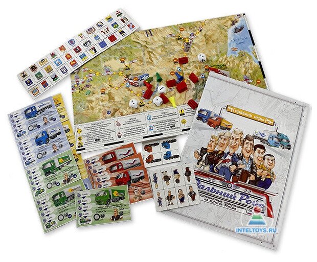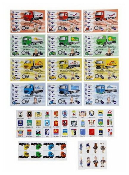 | Состав набора | картонное игровое поле, водительские карточки, картонные фишки водителей и машин, подставки под картонные фишки, пластмассовые фишки, карточки с гербами городов, кубики |