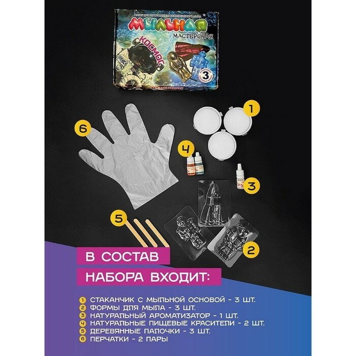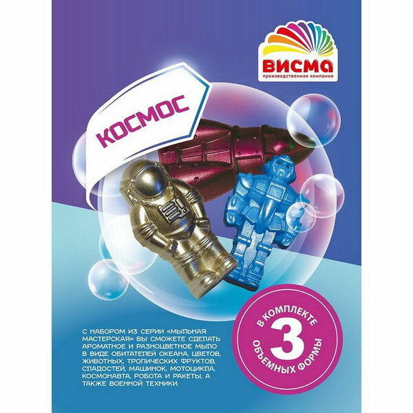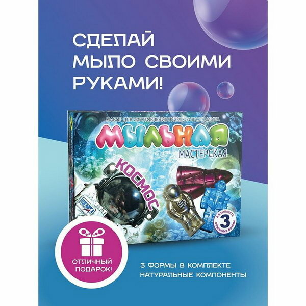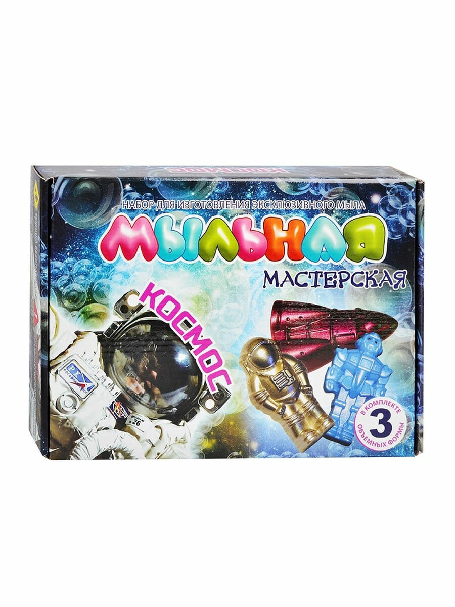 В этом удивительном наборе юные мастера мыловарения найдут все , что необходимо для создания эксклюзивного мыла. Причем, тематика набора очень оригинальная - космос. В комплекте три формочки, одна из которых изображает космонавта в скафандре, вторая - ракету, а третья - робота. Любители научной фантастики и мечтатели о космических глубинах будут просто в восторге! Все компоненты, из которых создается мыло, совершенно безопасны для детского творчества. Чтобы создать мыло, нужно воспользоваться прилагаемыми инструментами, ингредиентами и четко следовать инструкции. Получившимися кусочками ароматного мыла можно будет пользоваться в обычном режиме, а можно будет подарить друзьям на память.