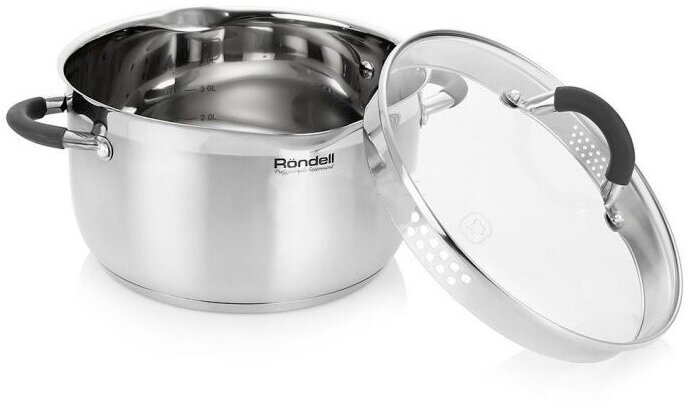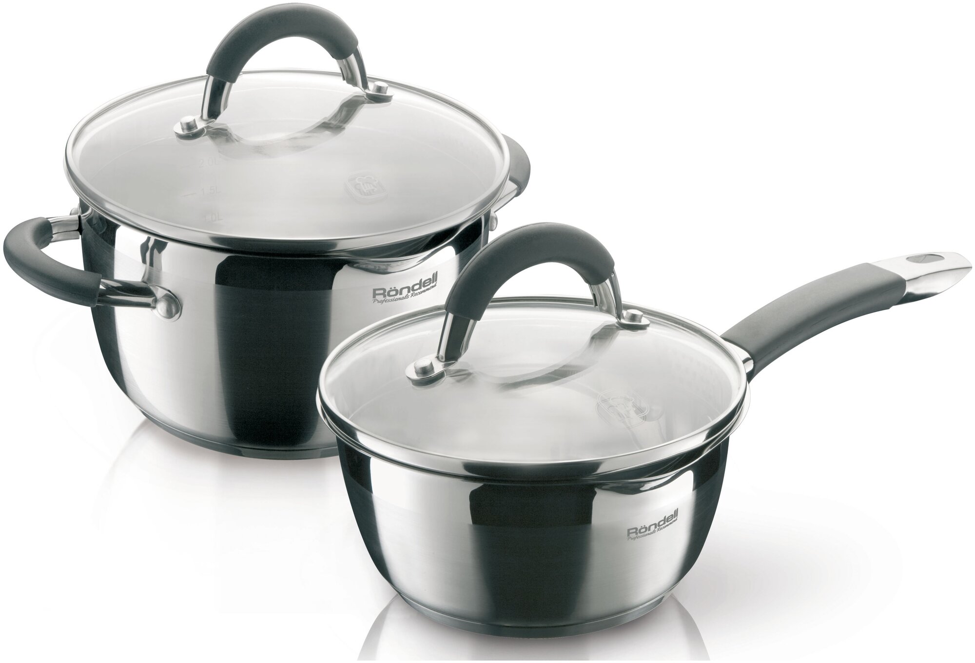 Набор посуды Rondell Flamme В набор входит:Кастрюля 20 см (3.2л) + крышка Ковш 16 см (1.3л) + крышкаВысококачественная нержавеющая сталь 18/10. Толщина стенок 0.6 мм. Тройное вштампованное, а затем вплавленное дно 5.0 мм. Комбинированная (зеркальная + матированная) обработка внешней поверхности. Отметки литража на внутренней поверхности посуды. Эргономичные крышки из термостойкого стекла со специальным ободком для удобного слива жидкости (2 диаметра отверстий). Ненагревающиеся ручки из нержавеющей стали с вставками из силикона. Надежное клепочное крепление. Плавный переход от дна к стенкам. Подарочная упаковка с ручкой. Буклет с рецептами. Подходит для всех видов плит и посудомоечной машины.