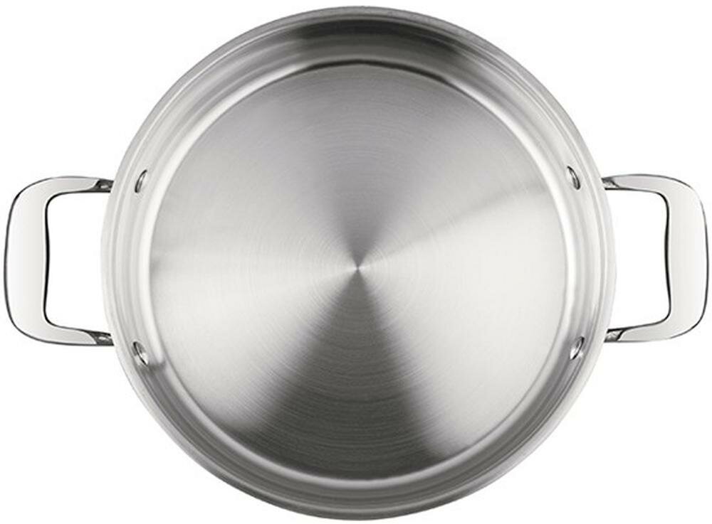 Технология «тройное вштампованное, а затем вплавленное дно» позволяет равномерно распределять и значительно дольше сохранять тепло не только по дну, но и по всему корпусу посуды, что предотвращает пригорание пищи, сохраняет вкусовые и питательные свойства продуктов. Жидкостекольная внешняя деколь - это трудоемкий метод нанесения на стальную поверхность слоя жидкого стекла.